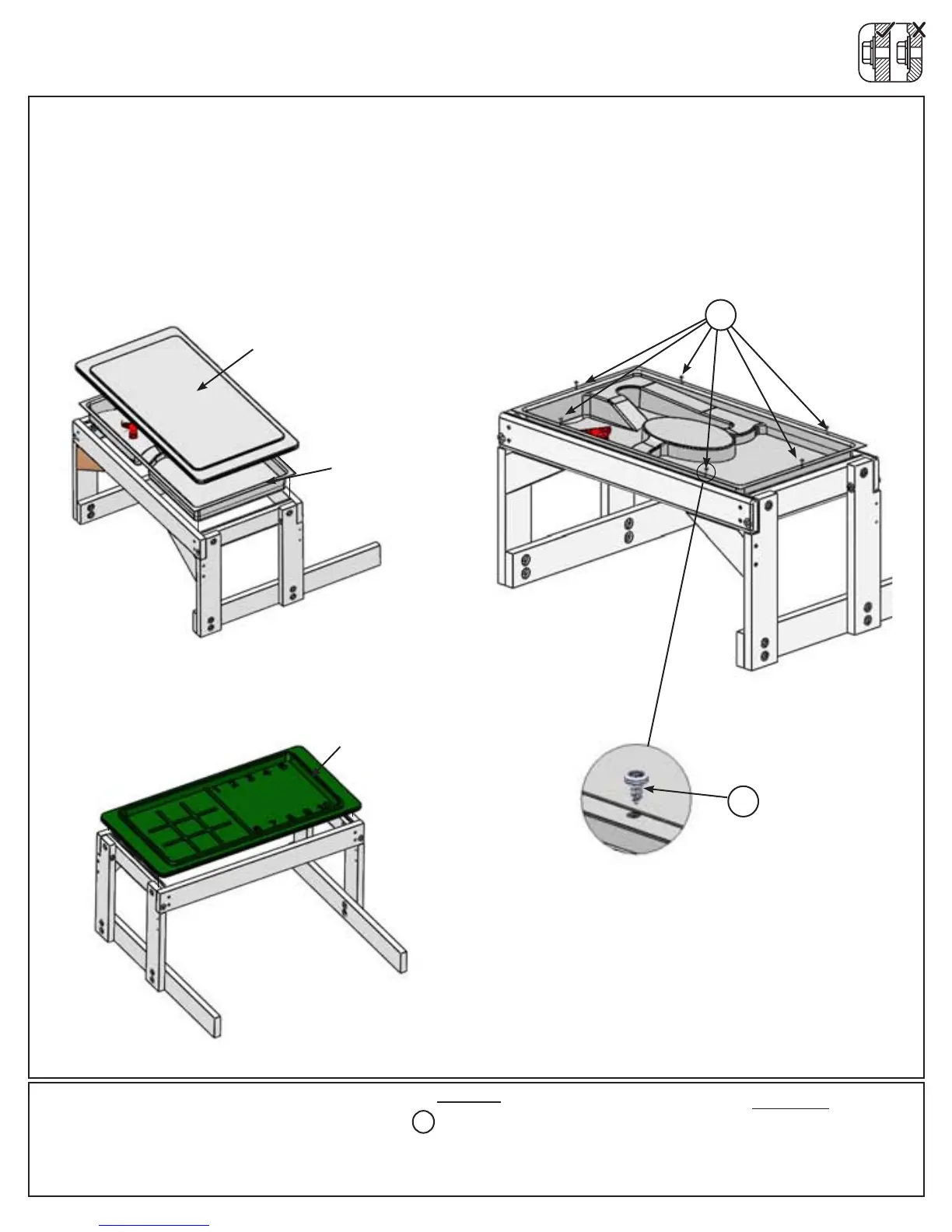K: Secure the Sand and Water Insert to the assembly using 6 (S13) #6 x 5/8” Pan Screws as shown in g. 1.10