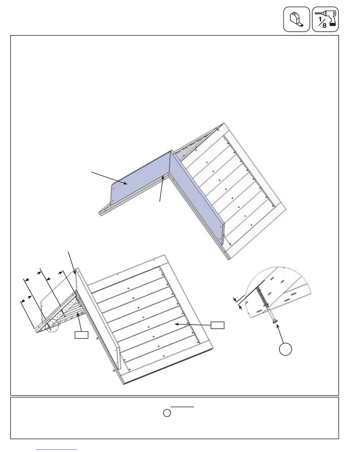 E: Attach Roof Spacer Assembly to Small Roof Assembly with 3 (S3) #8 x 2-1/2” Wood Screws per side. (g.