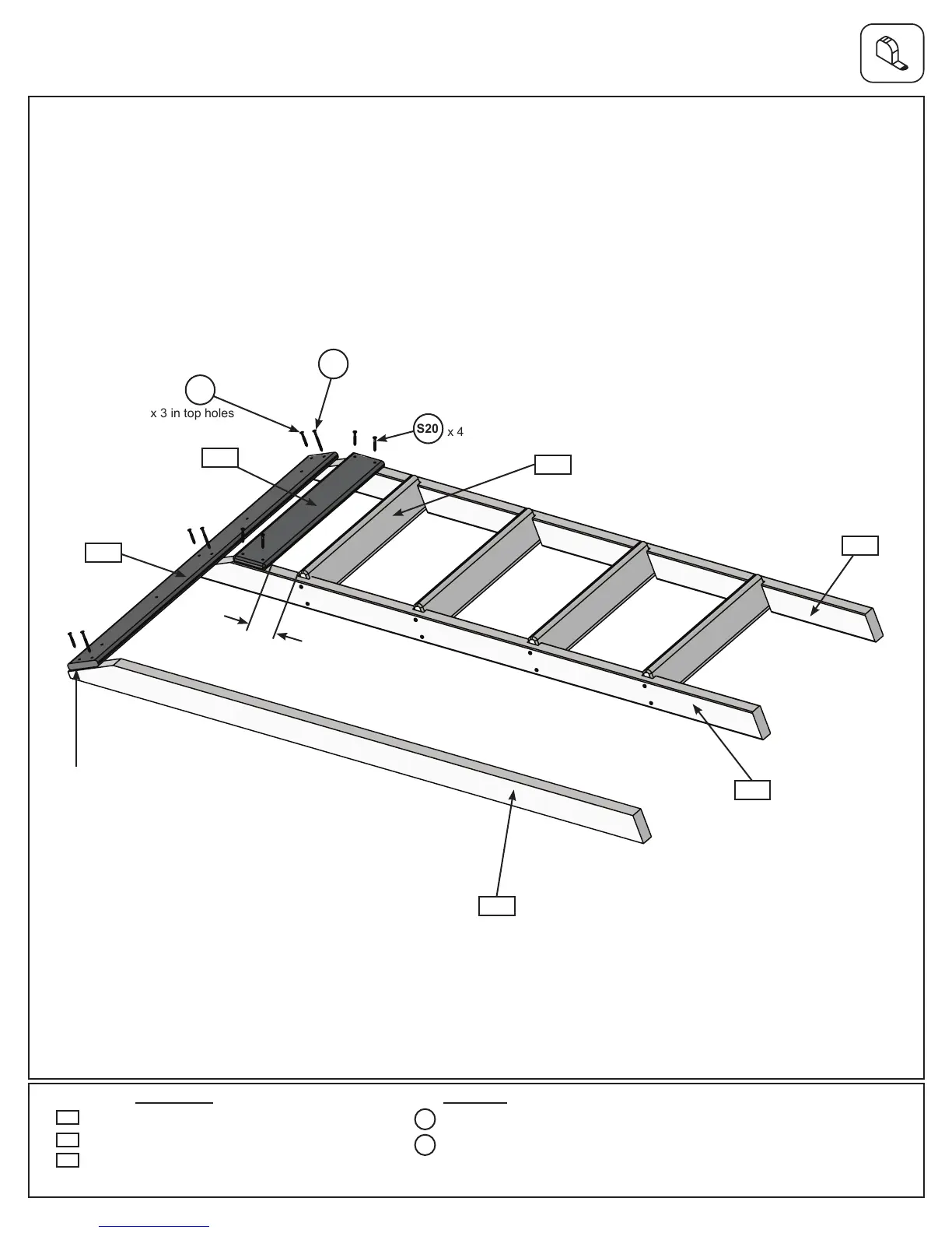 (022) Tread. Attach using 4 (S20) #8 x 1-3/8” Wood Screws. (g. 2.3)