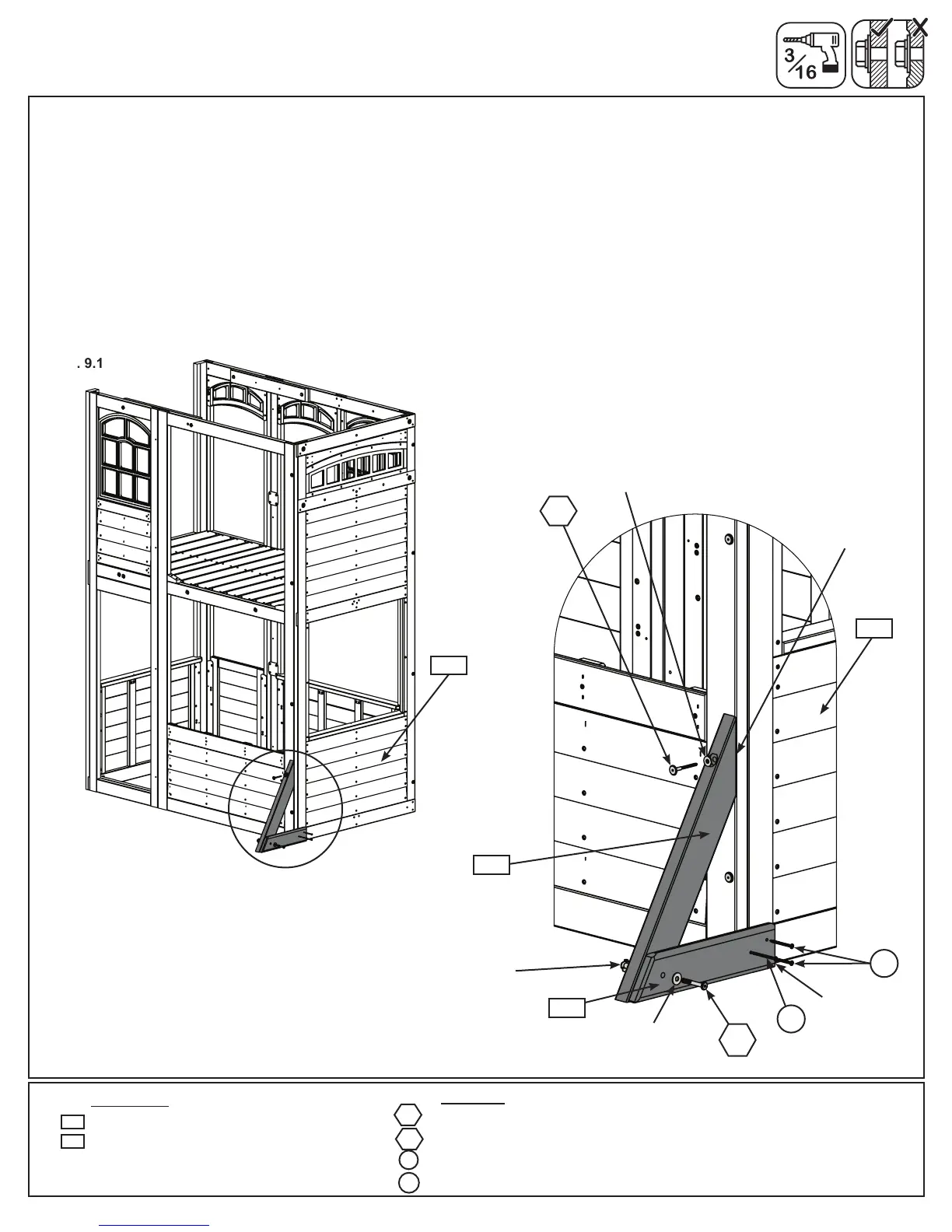 B: Pre-drill pilot hole with a 3/16” drill bit then attach (091) Diagonal to (050) SW Wall Panel with 1 (WL5) 1/4 x