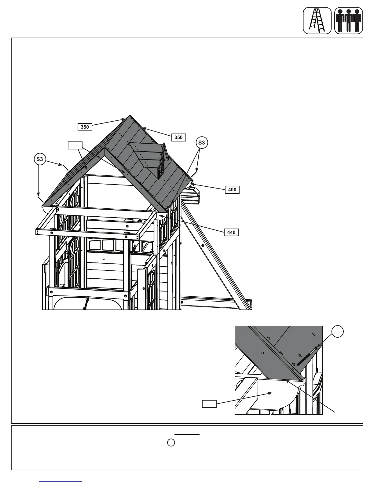 B: Attach (350) Roof Supports to (400) Swing Top and (440) Mid Top with 1 (S3) #8 x 2-1/2” Wood Screw per