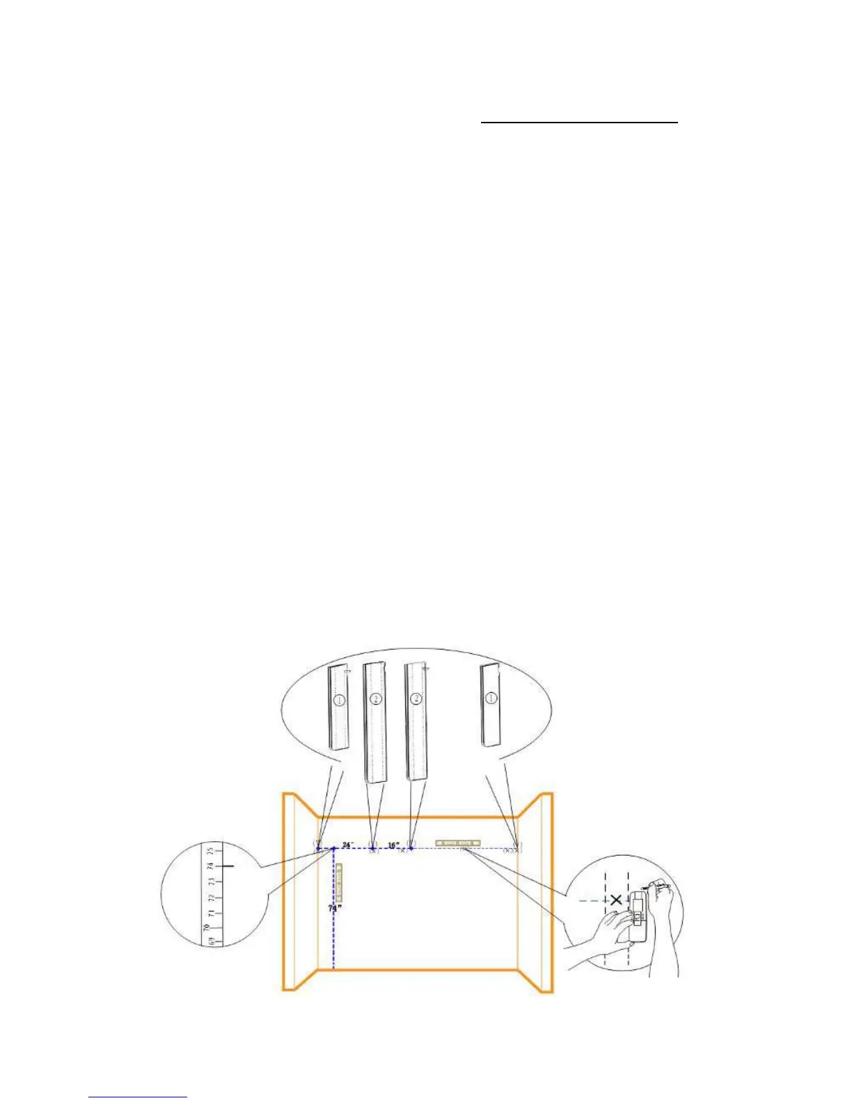 Locate studs by using a stud finder, lightly mark wall 1/4” below horizontal line to