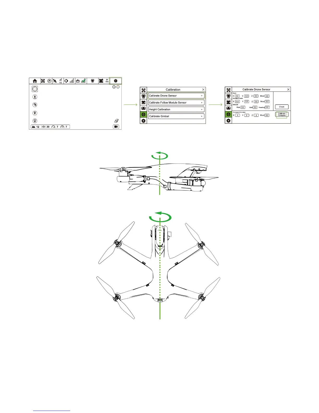 ④ When Green LEDs are on, hold the drone vertically with its nose pointing upwards. Rotate the drone around the center axis until