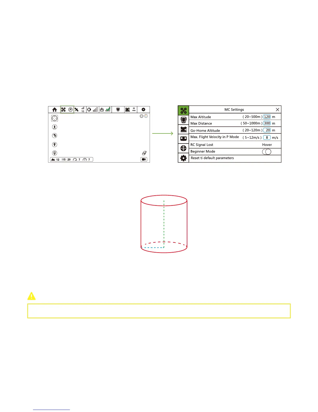 within the cylinder. When it reaches the max value, Drone will hover. Green dashed line represents the max altitude, while blue