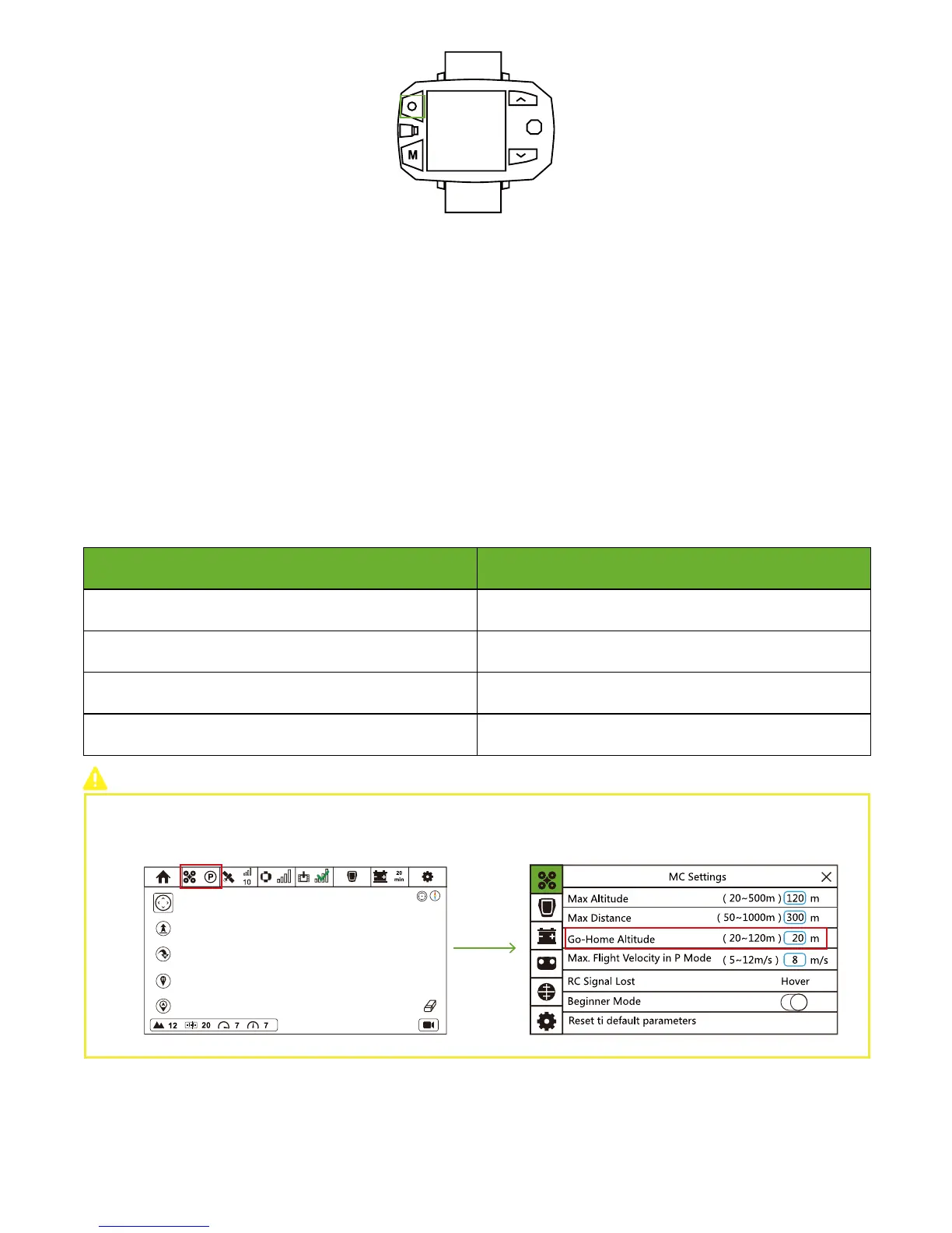 In flight interface, tap "Drone" icon to enter MC setting interface. Set a reasonable value in Go-Home Altitude column.