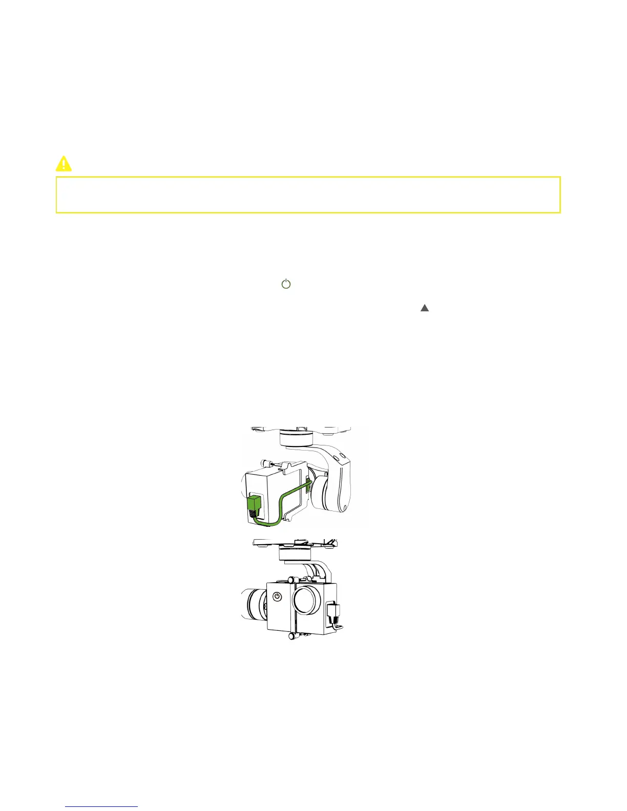 Detach the camera from the gimbal. Press Power Button ( ) over 5s. When GREEN LED is blinking, the camera has been turned on.