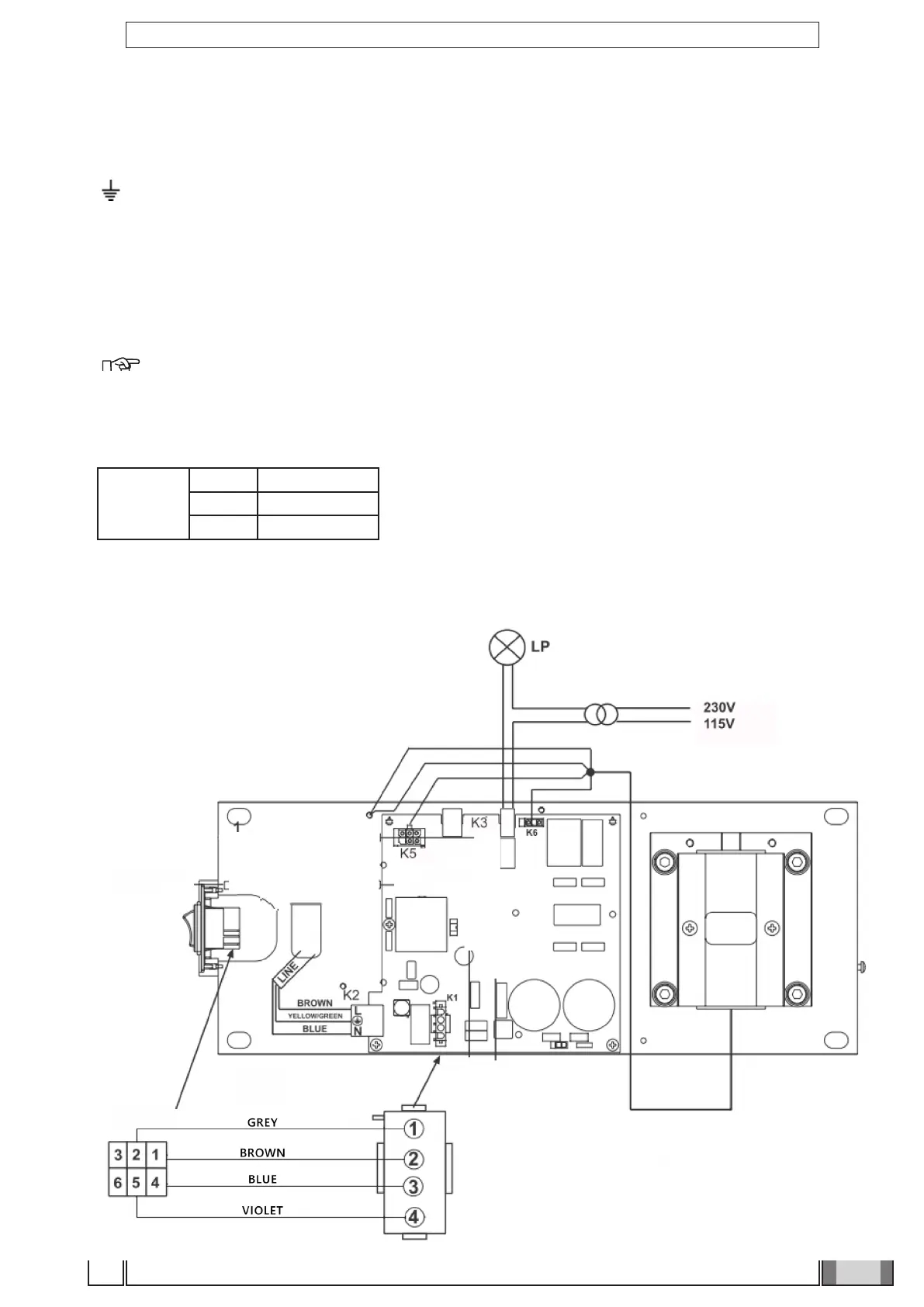 • Connect the power cable (LINE) to terminal K2, observing the following positions: