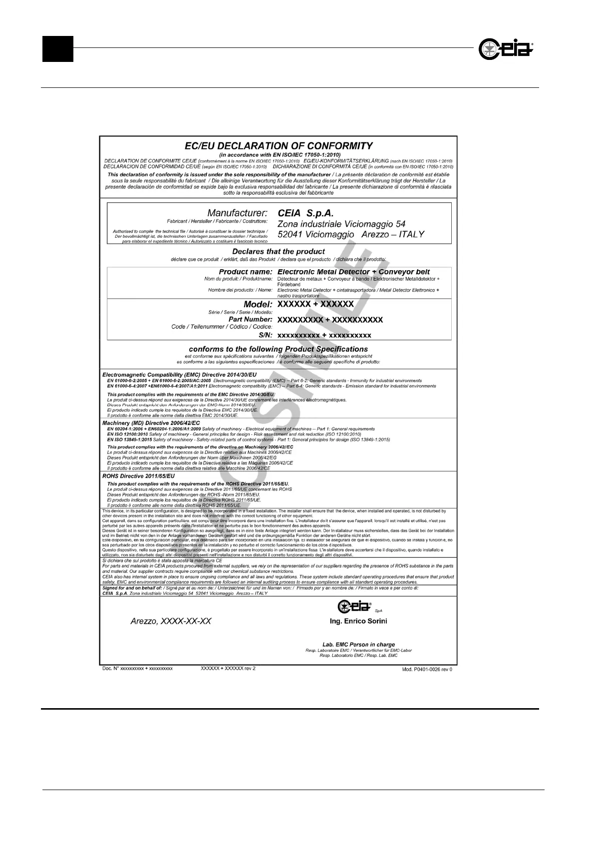 The following, in example, is the model of the Declaration of Conformity CE provided in original with