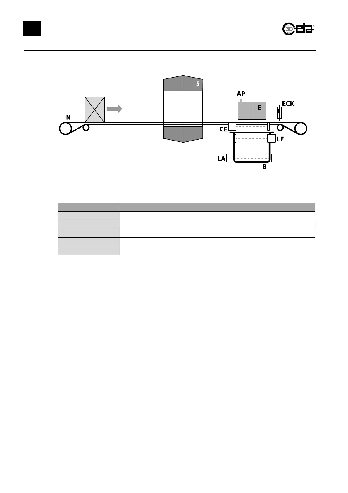 N: Conveyor belt; S: Metal Detector antenna; E: Ejection system;