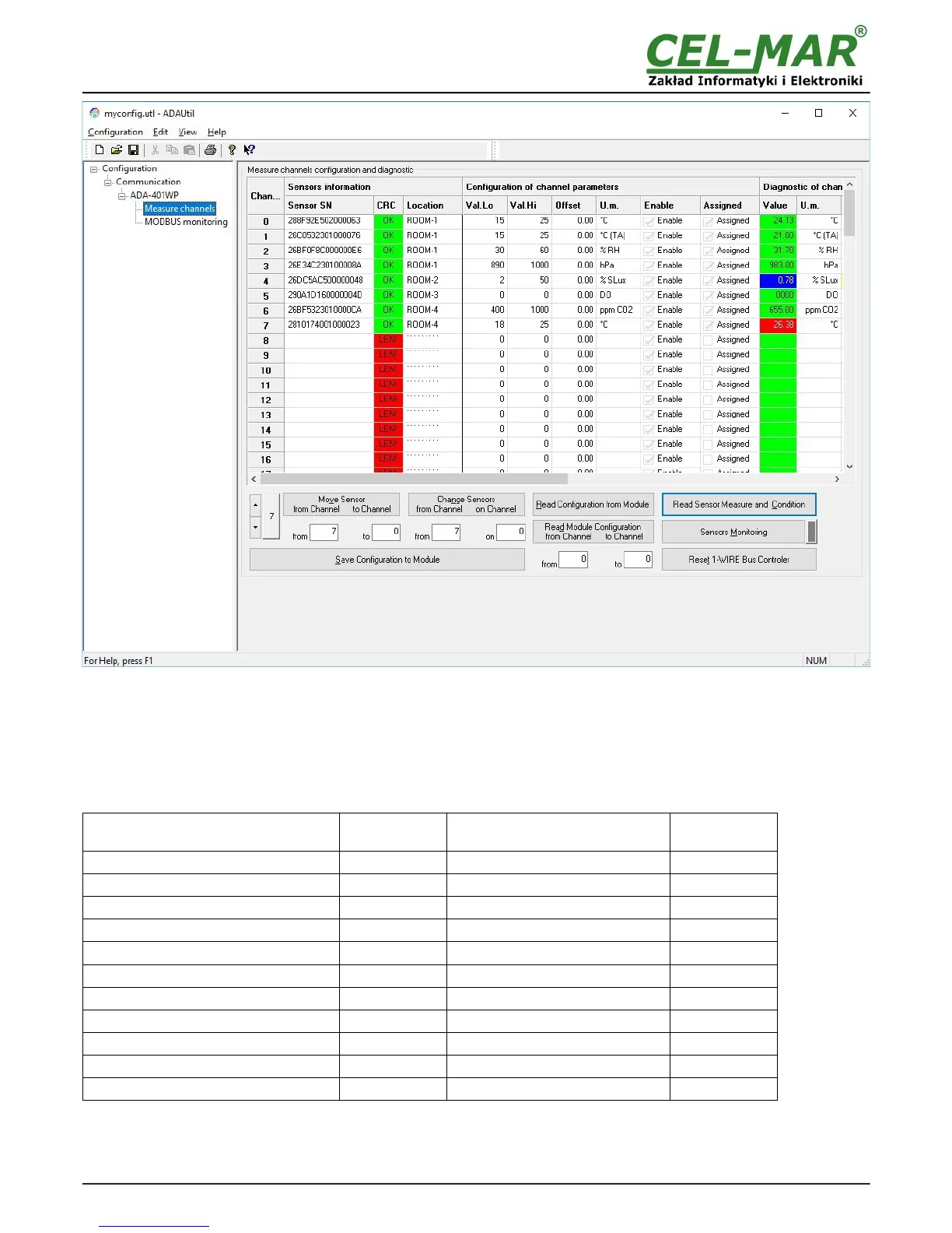 After readout the configuration of measurement channels, serial numbers of all searched sensors will be presented in the column