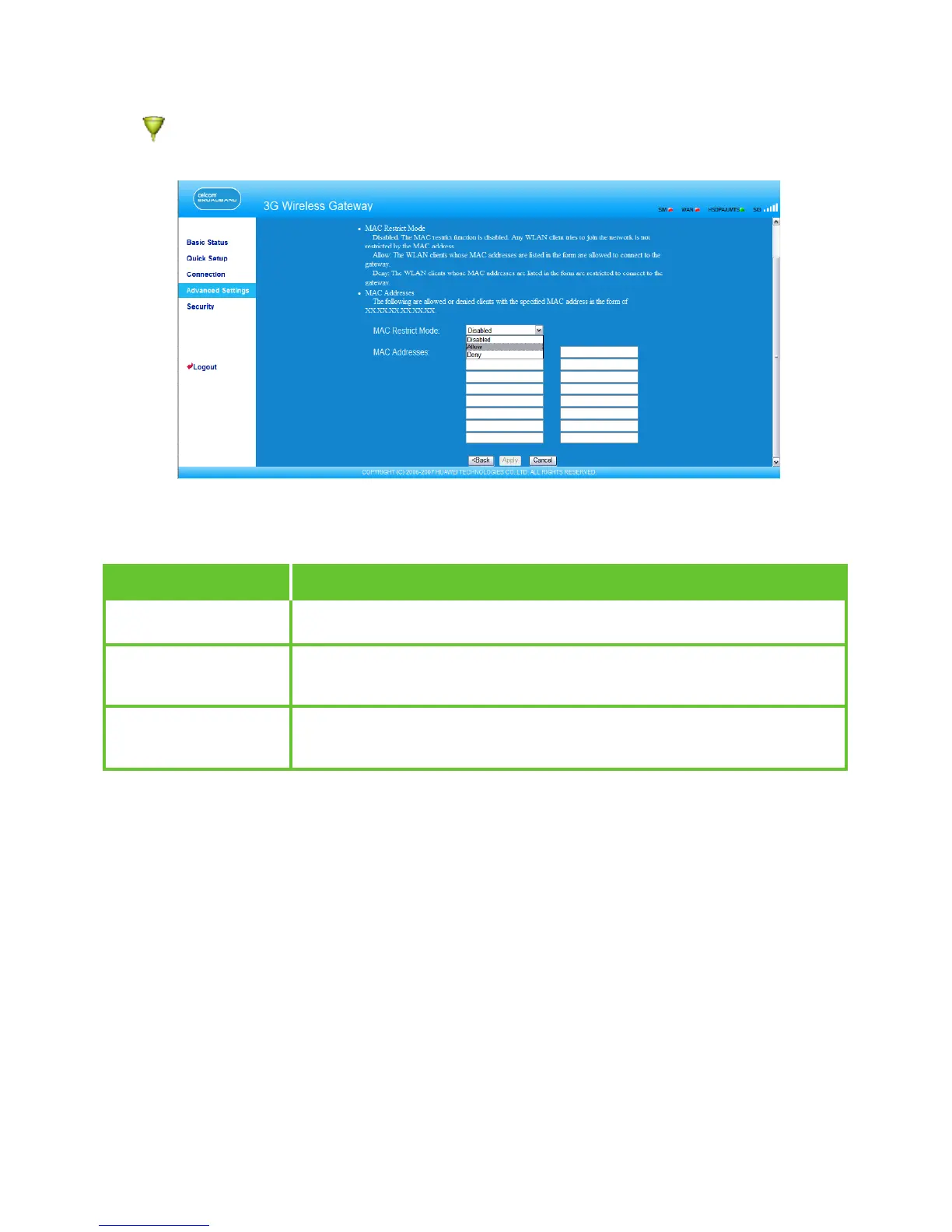 Enter MAC addresses in the list. The gateway can perform access control over the clients