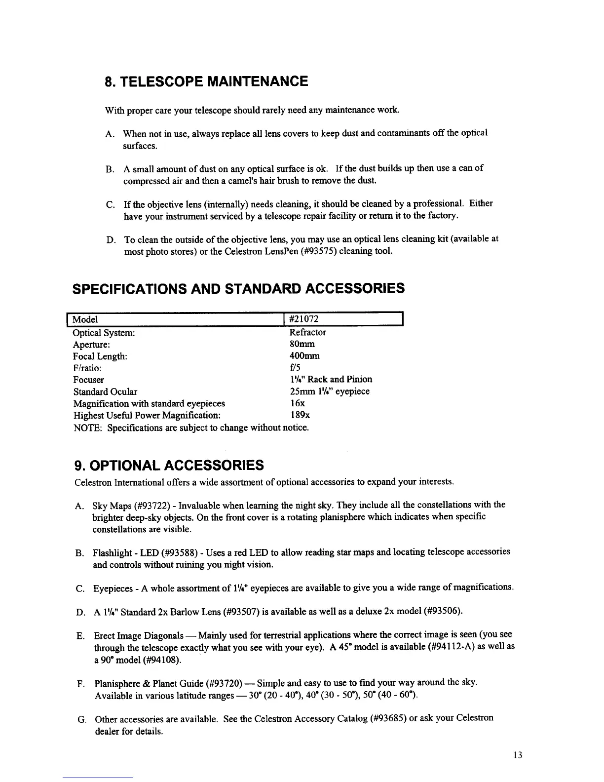 Celestron 21072 - Telescope Maintenance and Accessories; Maintenance and Specifications; Optional Accessories for Enhancing Use