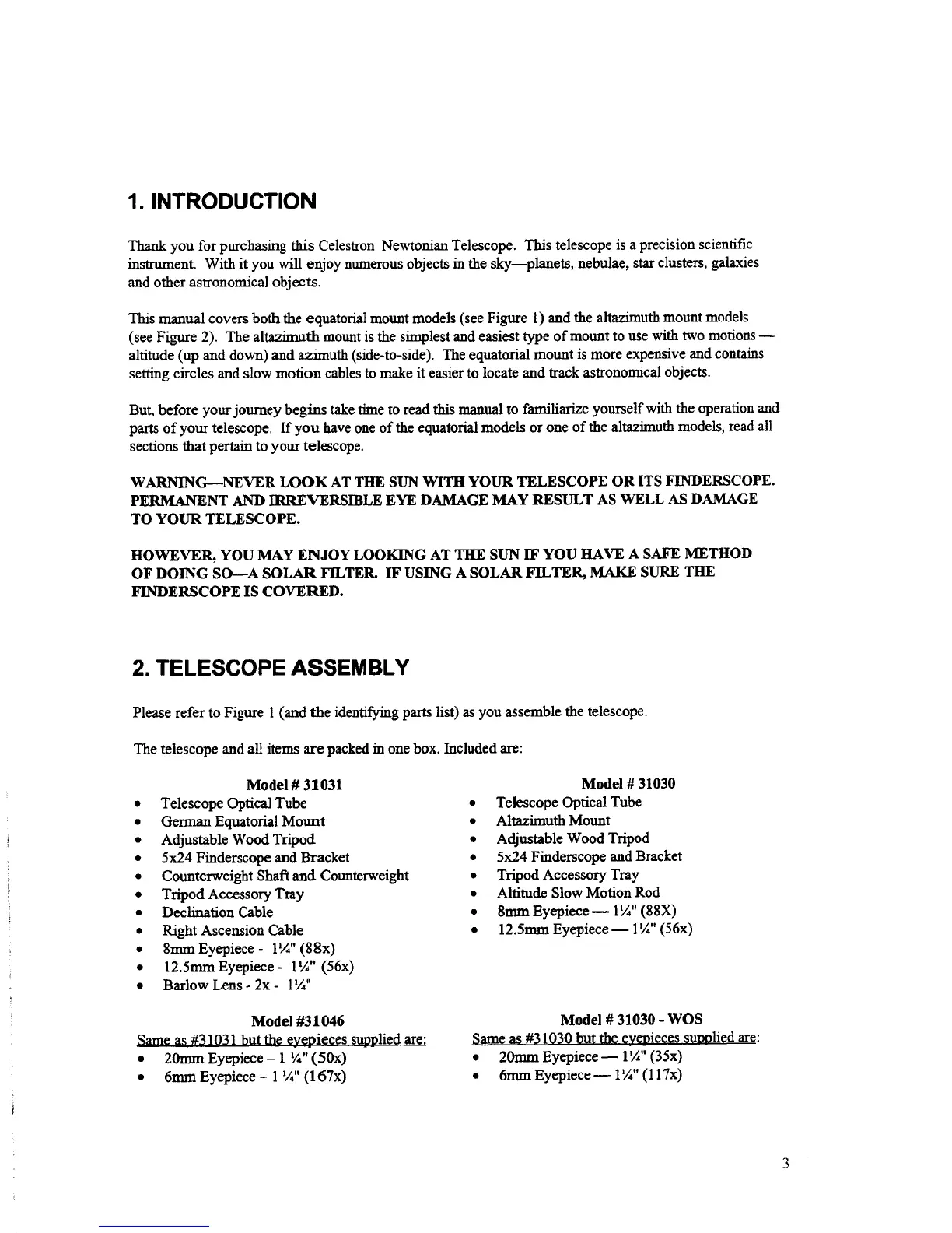 Celestron 31030 - 1. Introduction; 2. Telescope Assembly