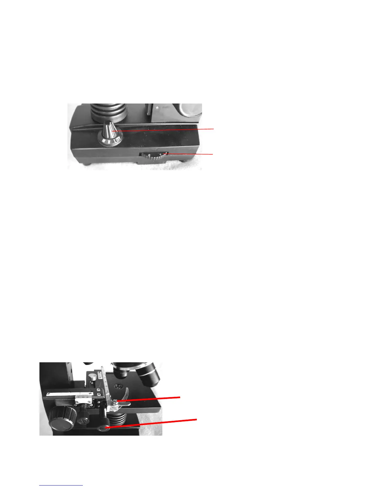 Vorderer Objekttisch-Bewegungsknopf. Hinterer Knopf links