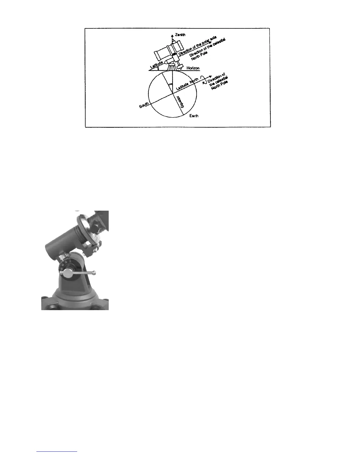 the polar axis is pointing. For specific information on adjusting the equatorial mount, please see the section