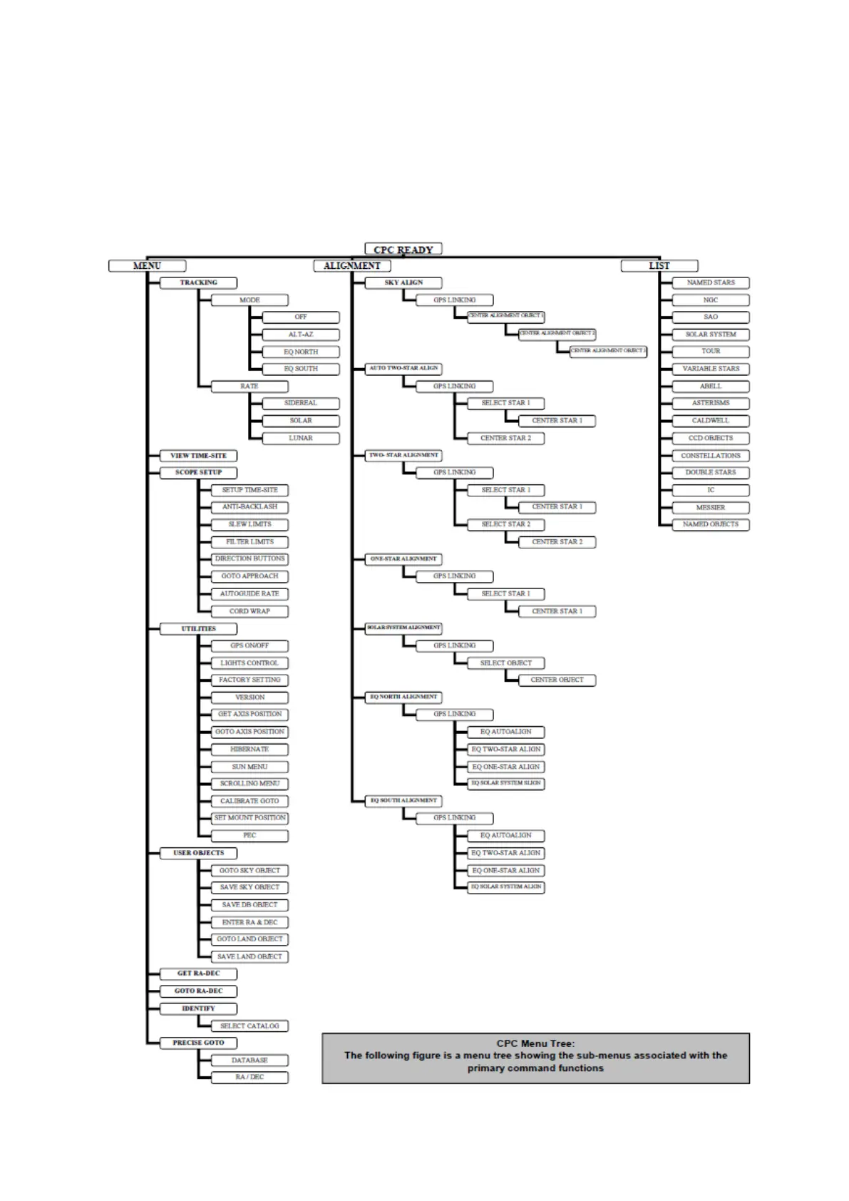 From the “CPC Ready” posion displayed on the hand controller, there are three secons of the menu system