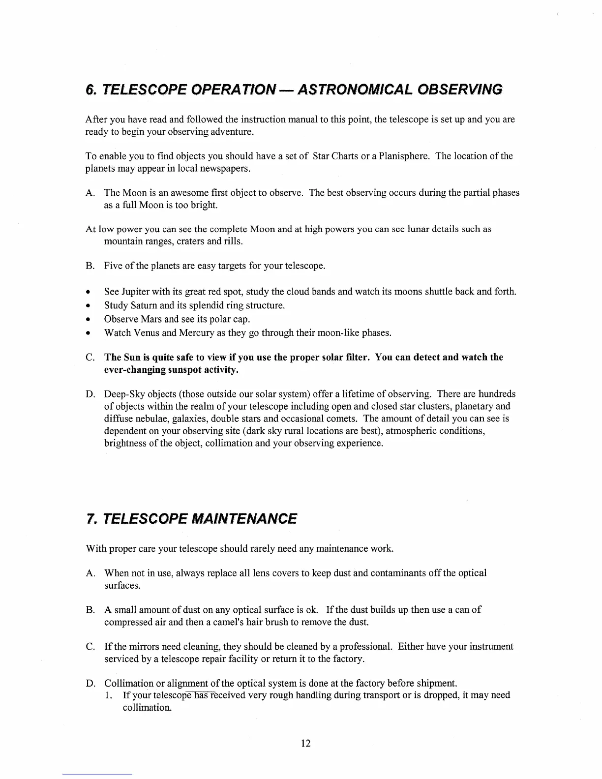 Celestron FirstScope 114EQ - TELESCOPE OPERATION - ASTRONOMICAL OBSERVING; TELESCOPE MAINTENANCE; General Care and Cleaning; Collimation Check and Adjustment