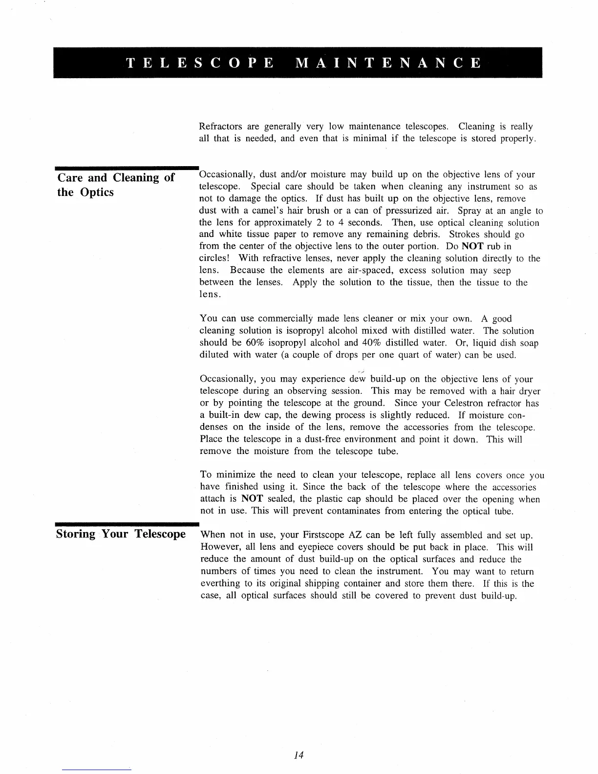 Celestron Firstscope 80 AZ - Telescope Maintenance and Storage; Care and Cleaning of the Optics