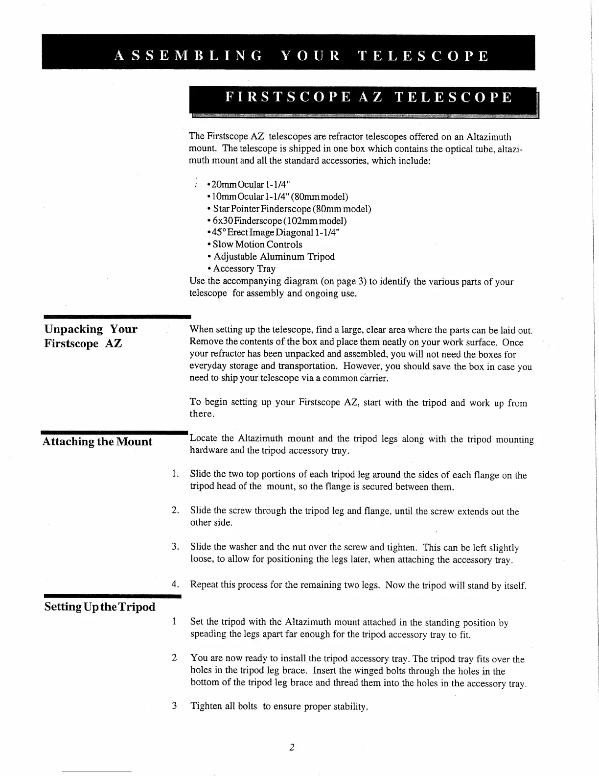 Celestron Firstscope 80 AZ - Firstscope AZ Telescope Assembly; Unpacking Your Firstscope AZ; Attaching the Mount to the Tripod; Setting Up the Tripod