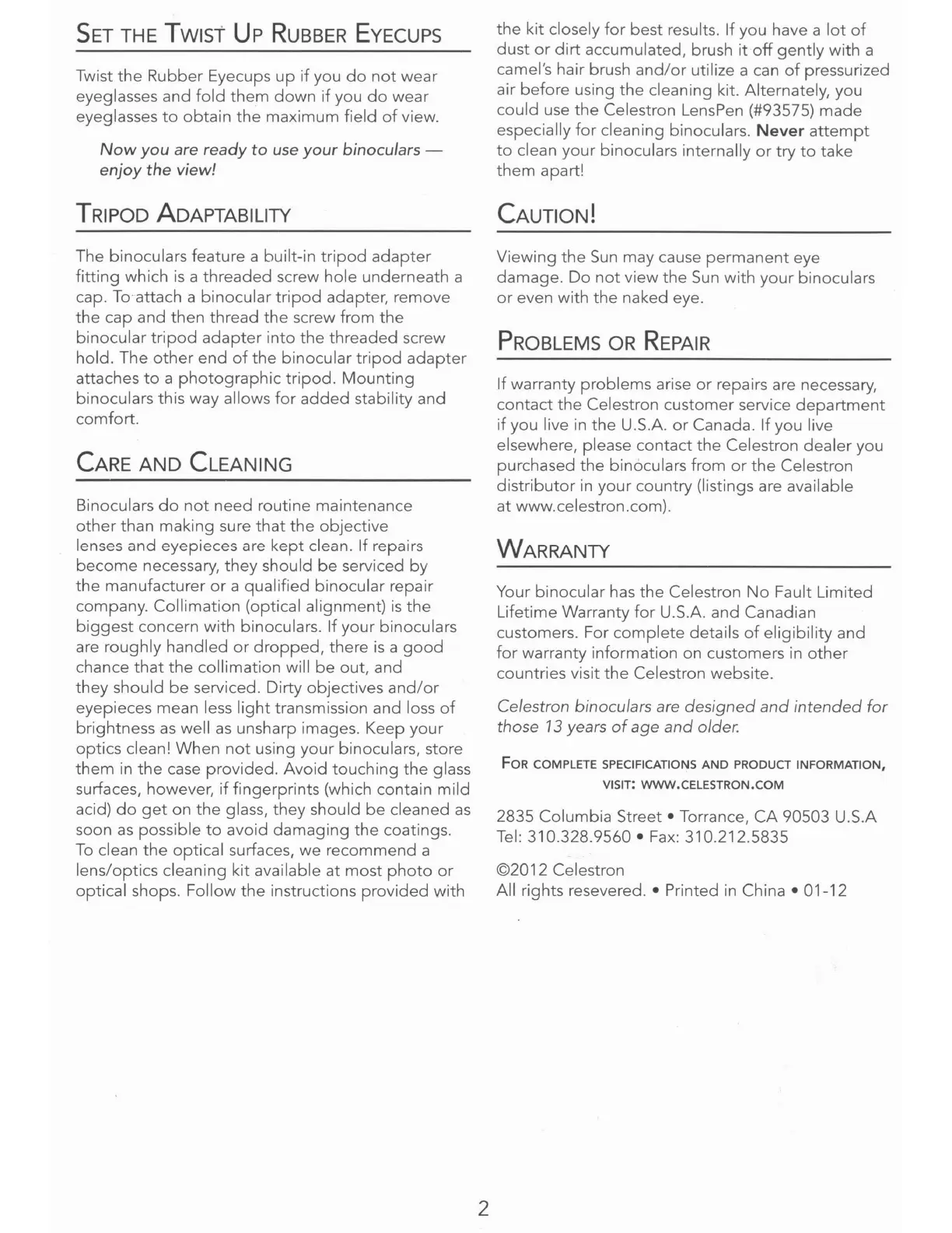 Celestron GRANITE - General Safety Warning; Binocular Operation and Adjustment; Adjusting Interpupillary Distance; Setting the Diopter and Focusing