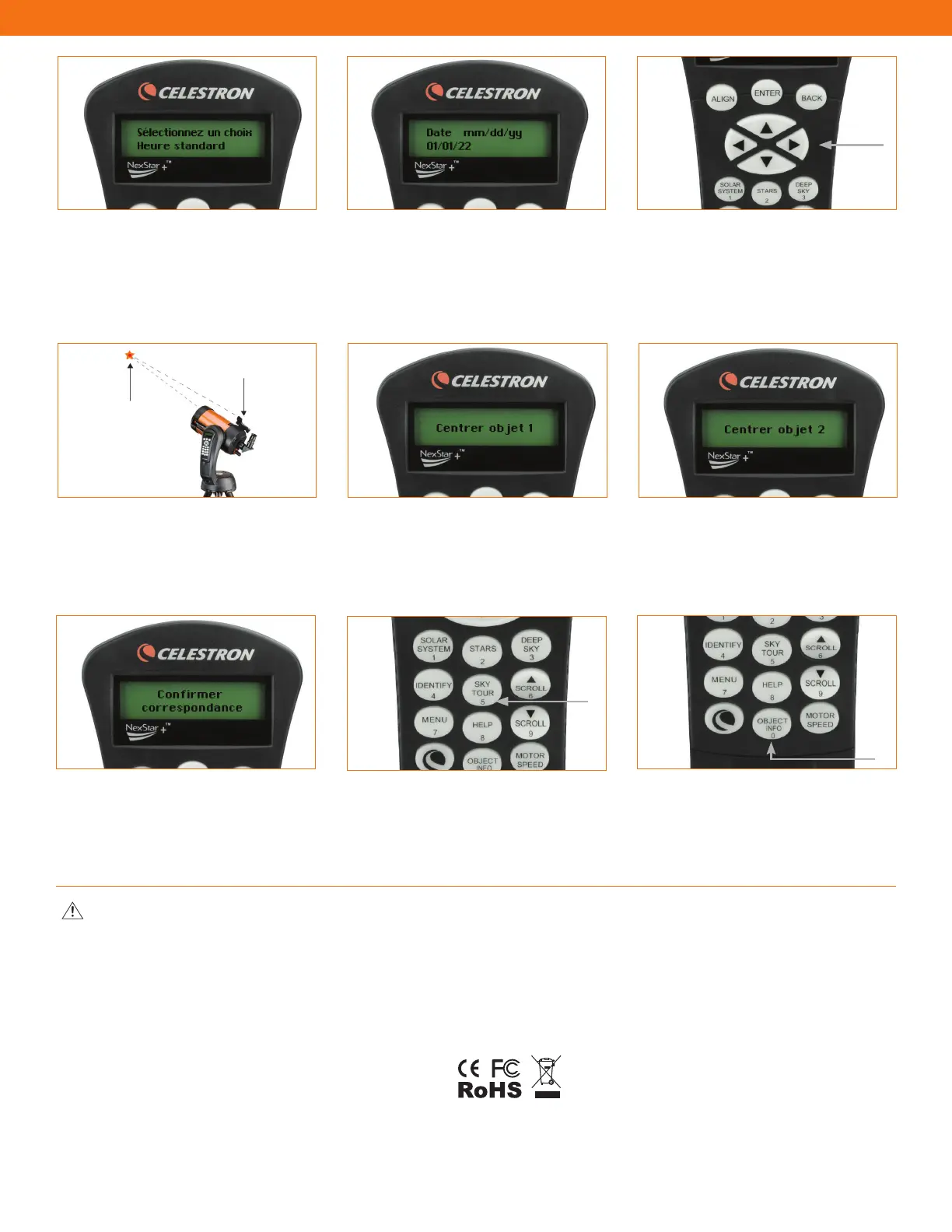 • Ne pointez jamais télescope directement vers le Soleil (à moins d’utiliser un filtre solaire approprié). Des dommages irréversibles peuvent être infligés à la caméra ou aux optiques.