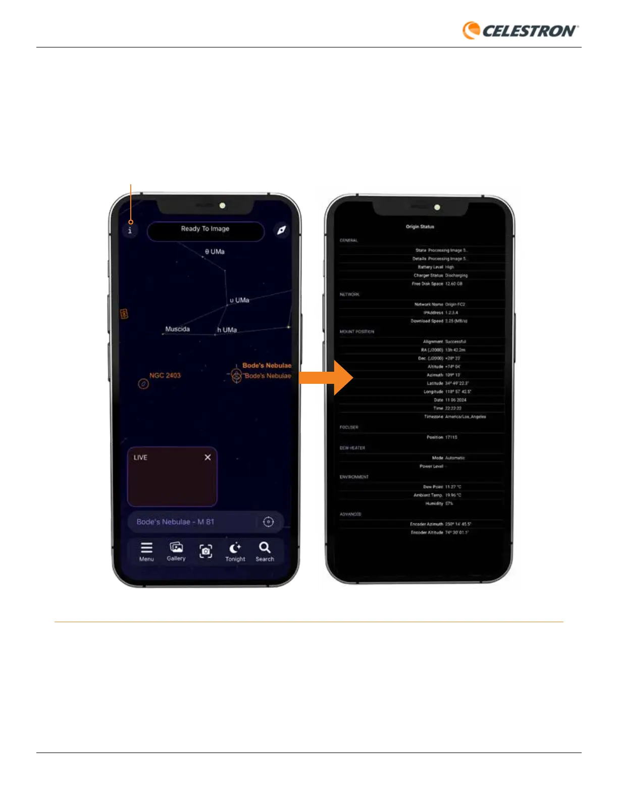 Fig. 10: You can access the Origin Status page from the Info icon in the upper left corner of the Planetarium View.