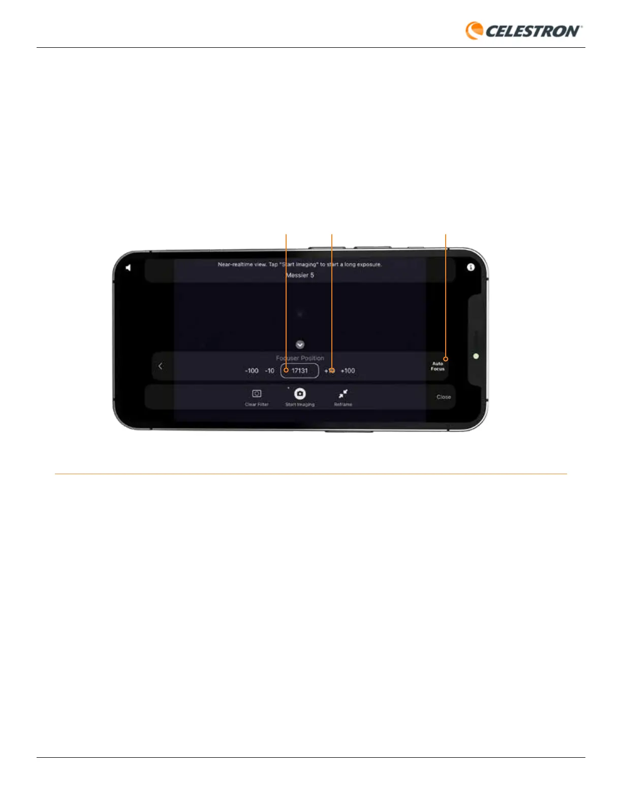 To manually focus, use the -100/-10/+10/+100 controls to move the focuser in and out until stars come into sharp focus. You can see