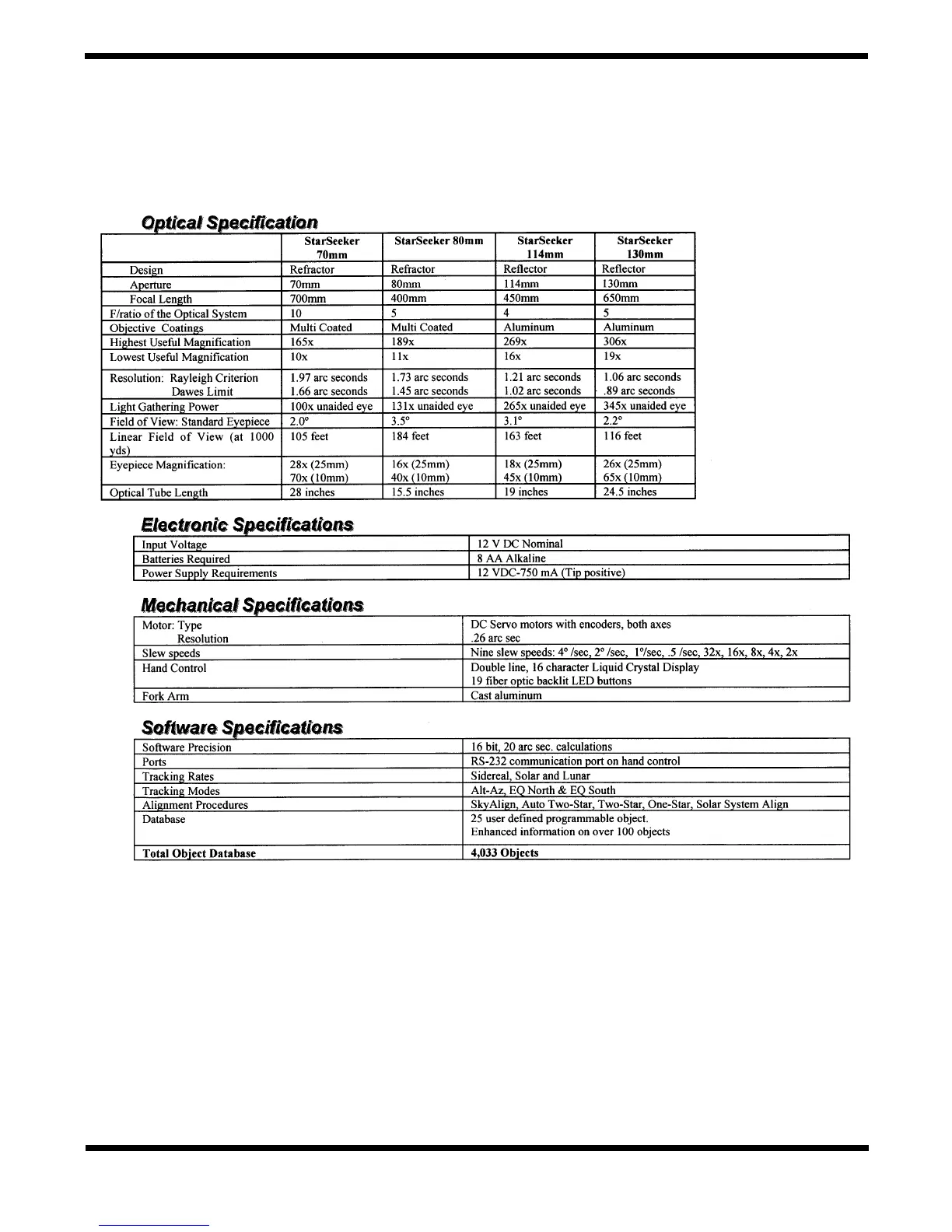 Celestron StarSeeker - Appendix A; Technical Specifications