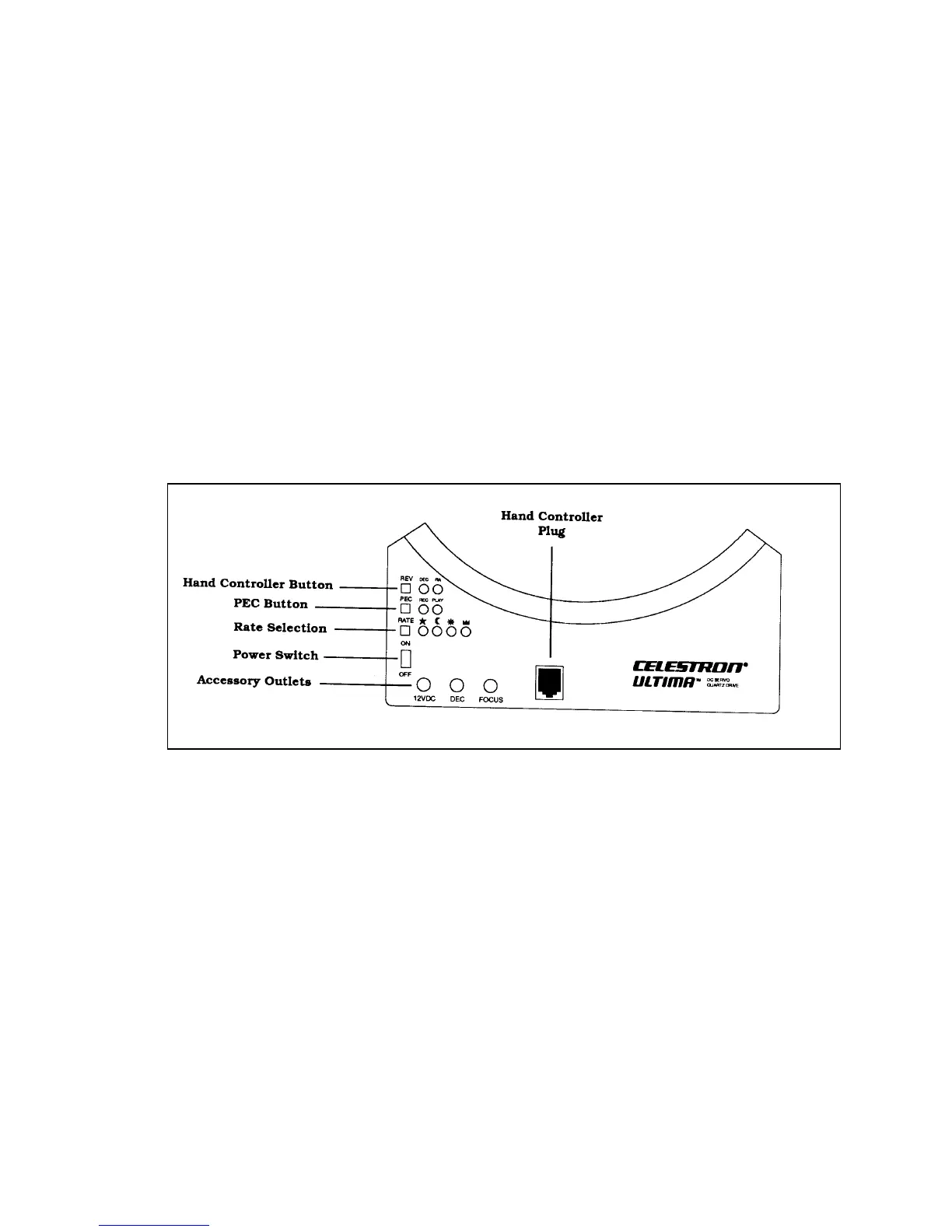 The ‘ON/OFF’ switch supplies power to the drive motor. Each time the drive is turned on, it defaults to sidereal rate