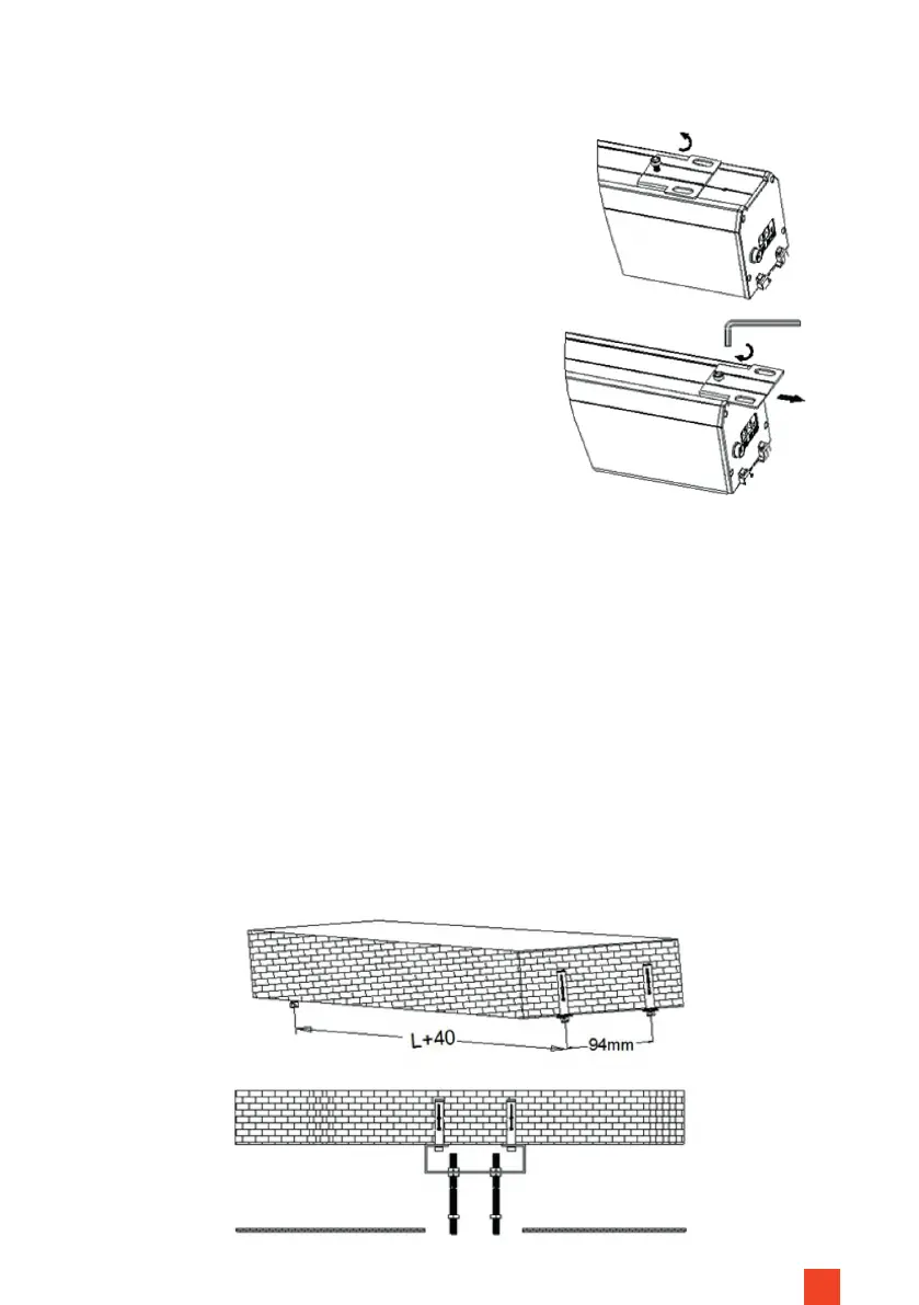 gen (E) in. De afstand tussen de boorgaten moet L+40 mm x 94 mm bedragen.