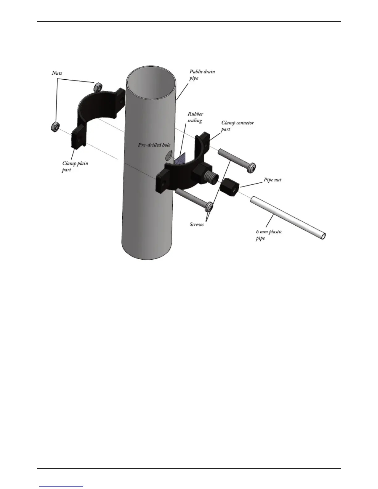 2. Place the two clamps on the pipe in a way, that the hole on the drain pipe is concentrical to the