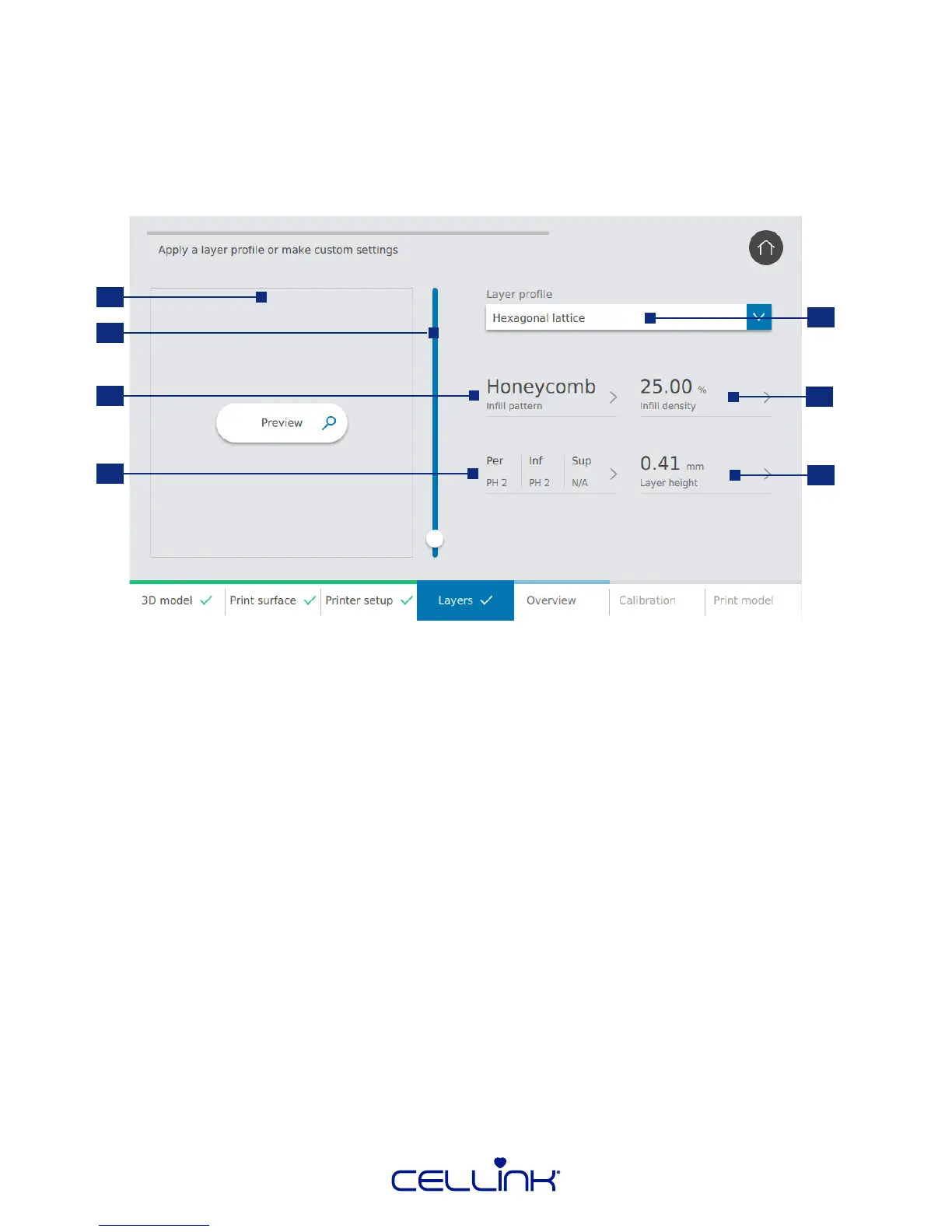 7. Layer height – Indicate layer height. CELLINK advises to set the layer height equal to the