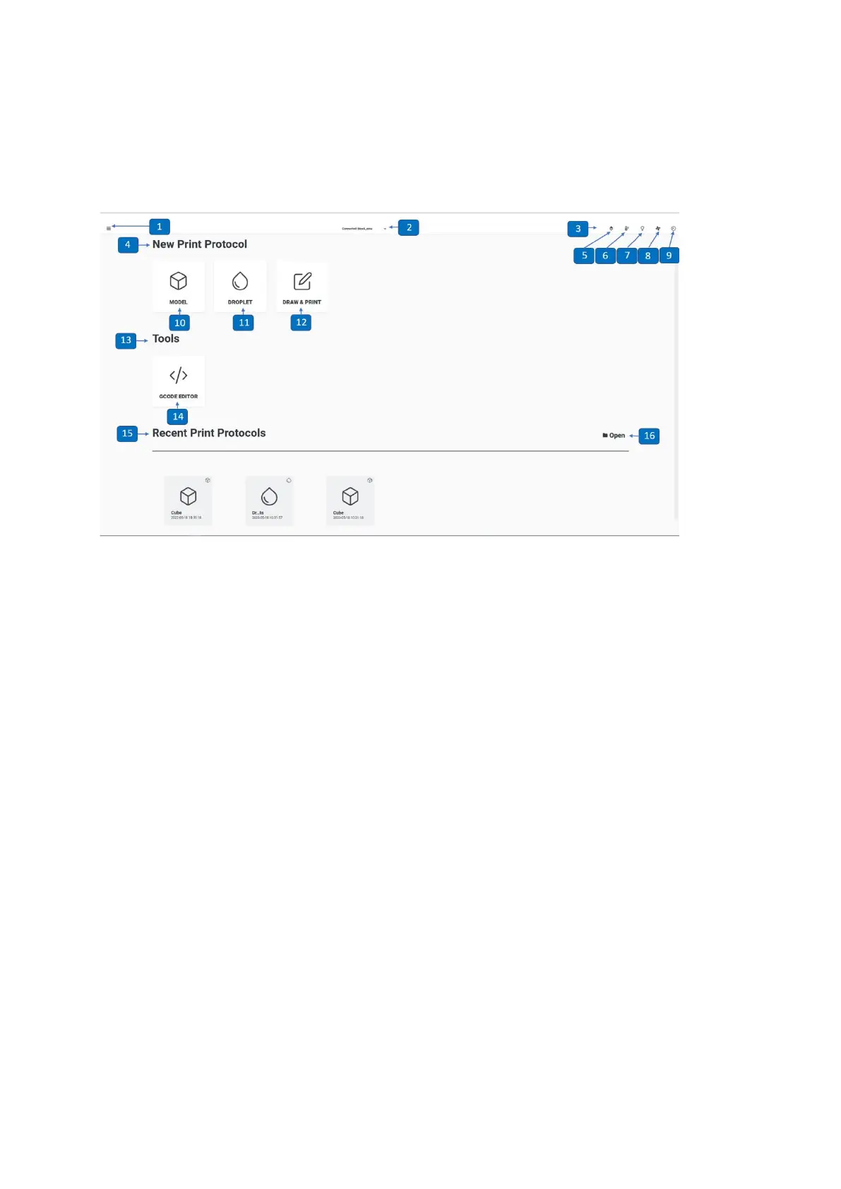 4. New Print Protocol: In this section you find the Model print, Droplet print and Draw &