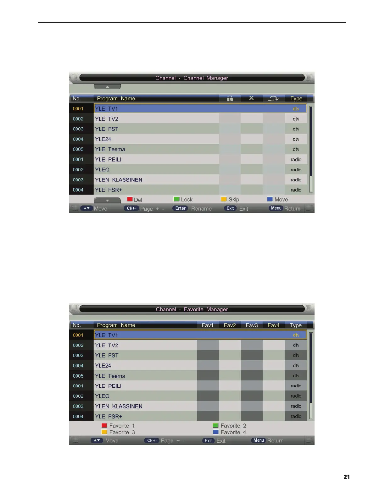 Press ▲/▼ button to select Channel Management, and then press ENTER button to20 rename the channel selected.