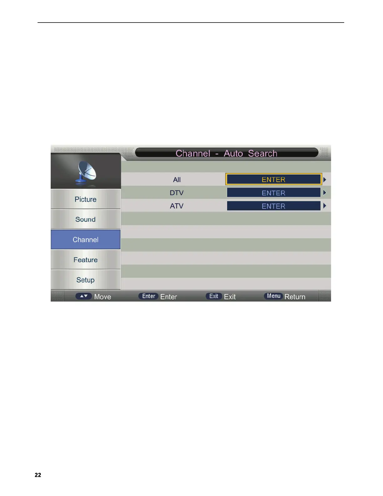 Press ▲/▼ button to select DTV Manual Search, and then press ENTER button to start the scan.
