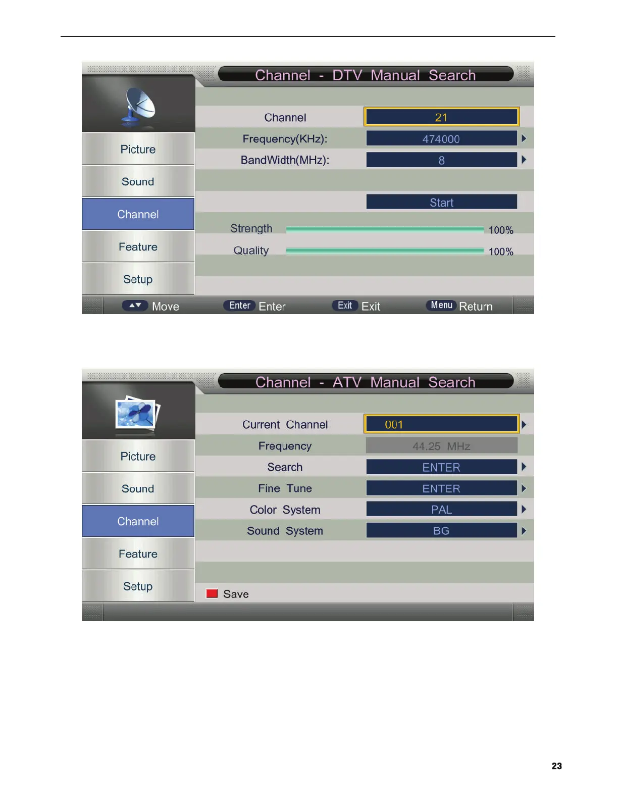 Press ▲/▼ button to select ATV Manual Search, and then press ENTER button to start the scan the ATV channels.