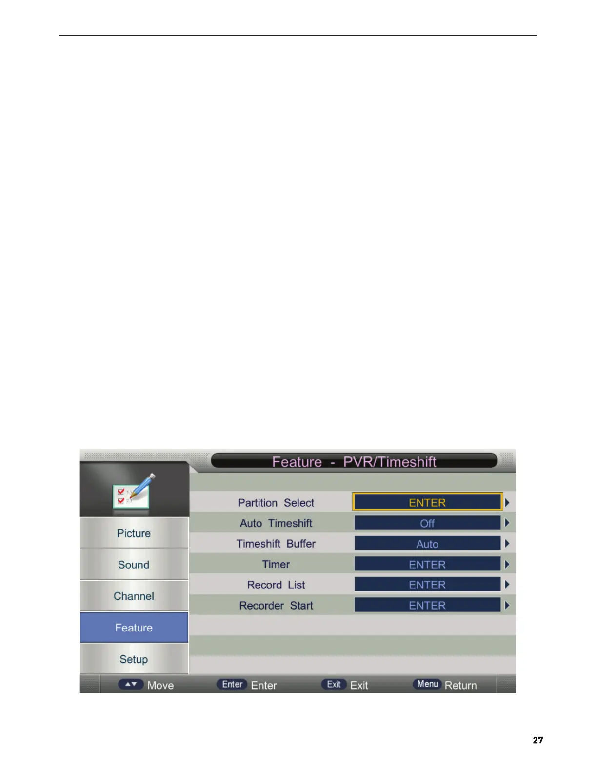 Press ▲/▼ button to select PVR/TimeShift, then press ENTER button to open the sub-menu. As follows: