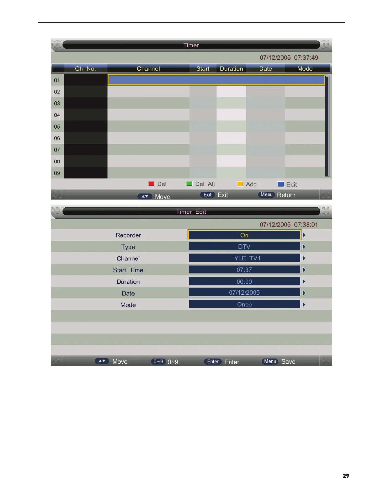 Press number keys and direction keys, user can set the channel, date, start time, mode, type and record length