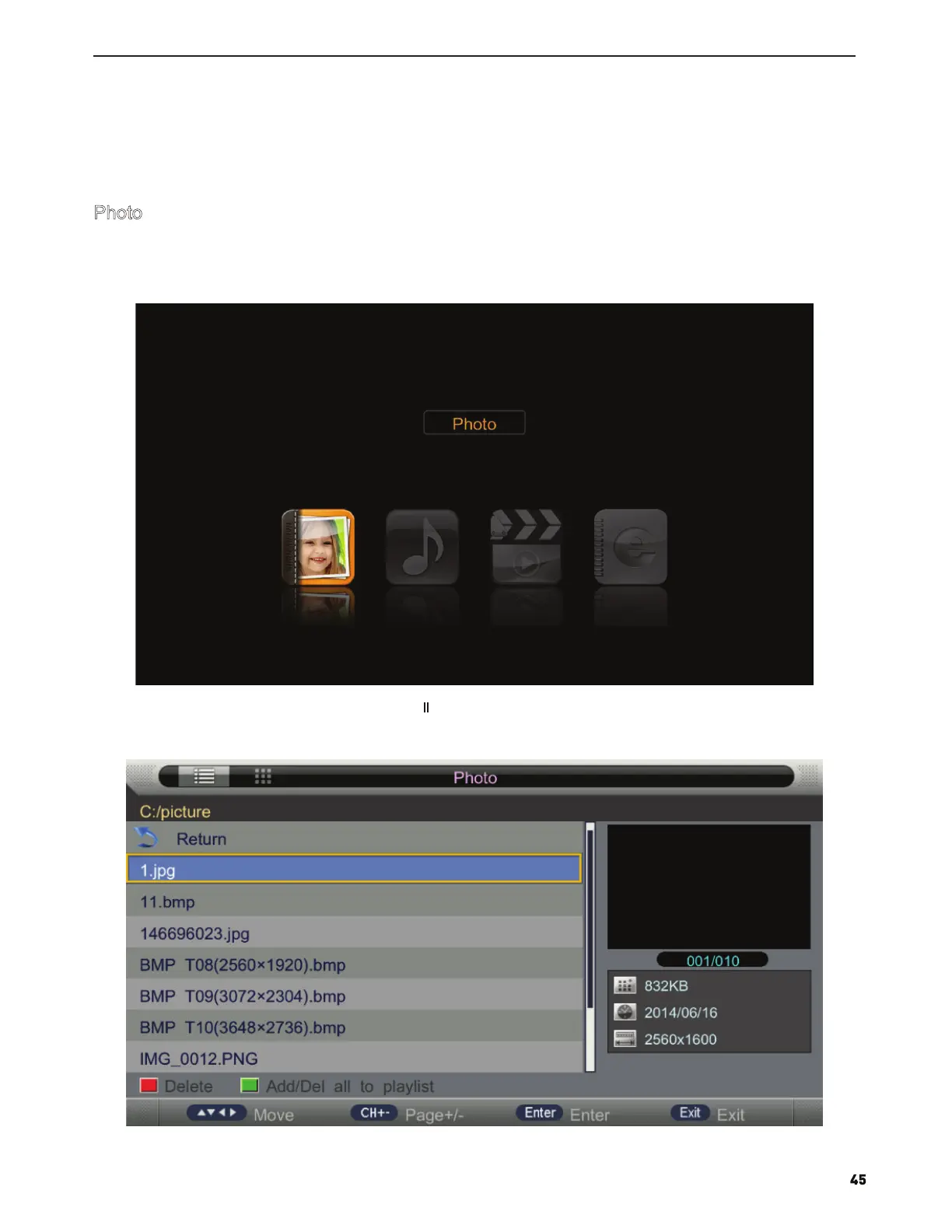 Press ◄/► button to select Photo in the main menu, and then press ENTER button to enter.