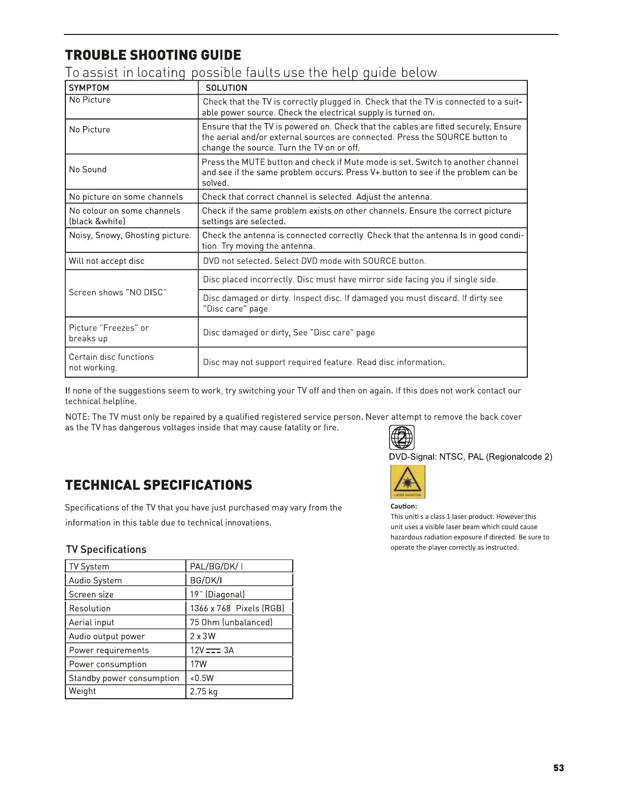 Cello Electronics Traveller - Troubleshooting and Specifications; Troubleshooting Guide; Technical Specifications
