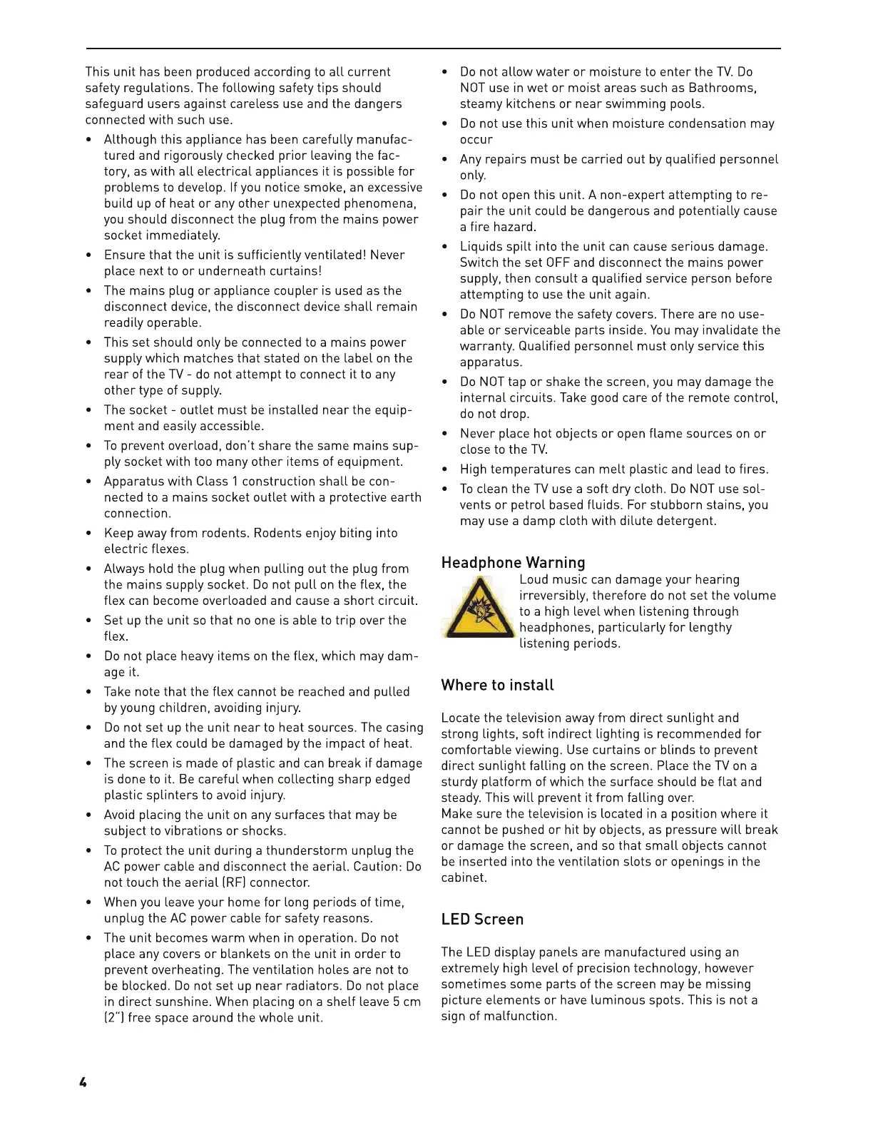Cello Electronics Traveller - Headphone Warning; Installation Location Guidance; LED Screen Characteristics