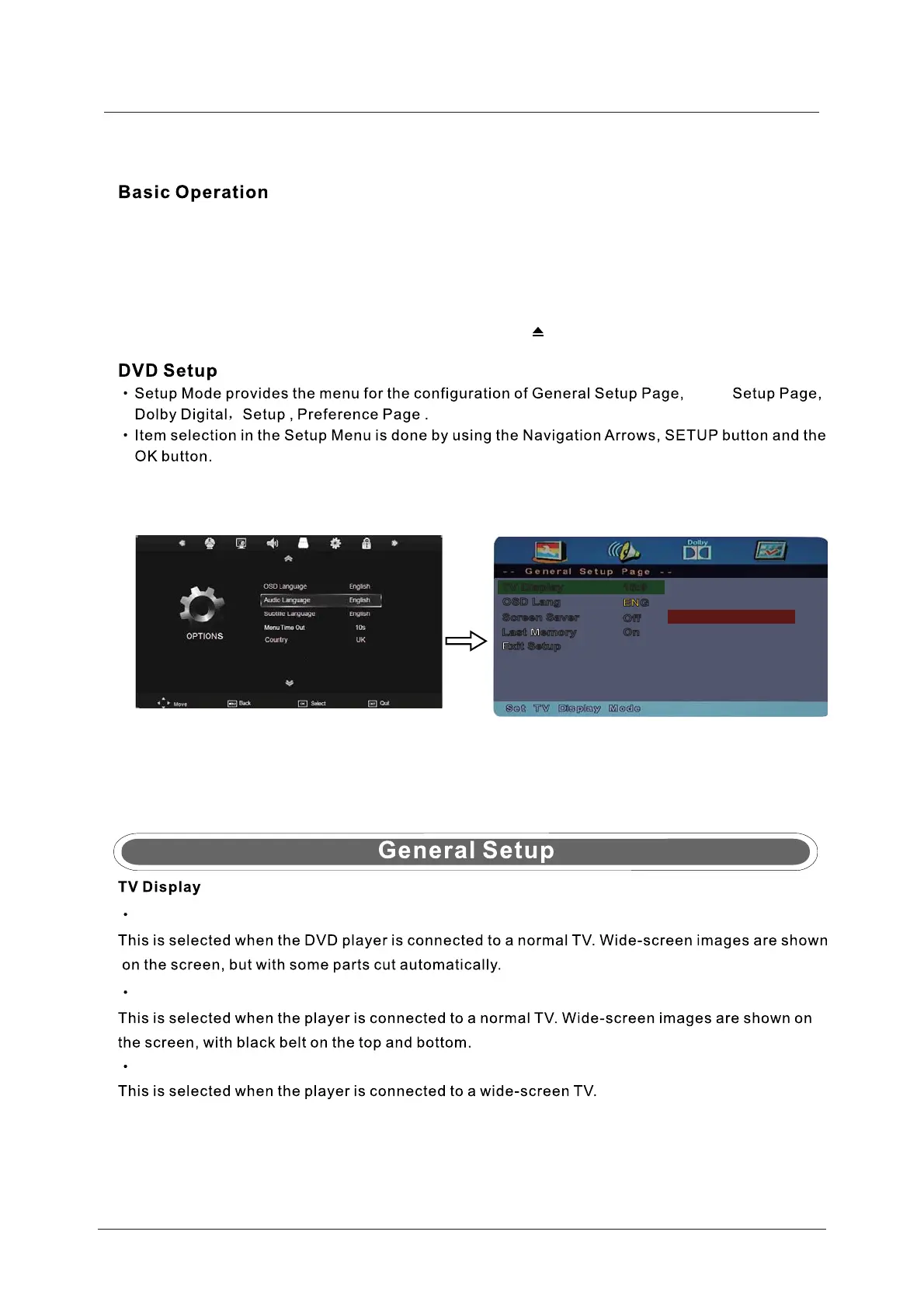 Press MENU button on the remote control and select OPTIONS menu as below, then select DVD SETUP,