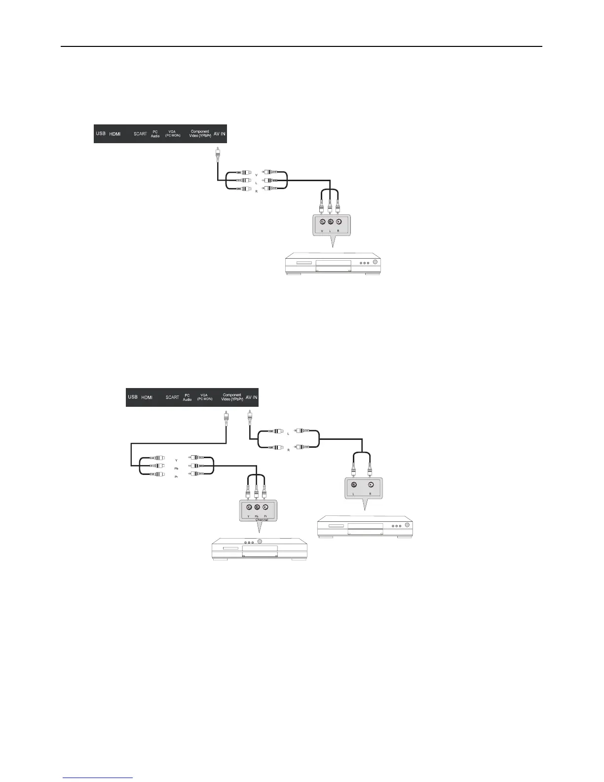 Connect the VIDEO and AUDIO output jack of the DVD or VCR to the VIDEO jacks on the TV set using the supplied YPbPr