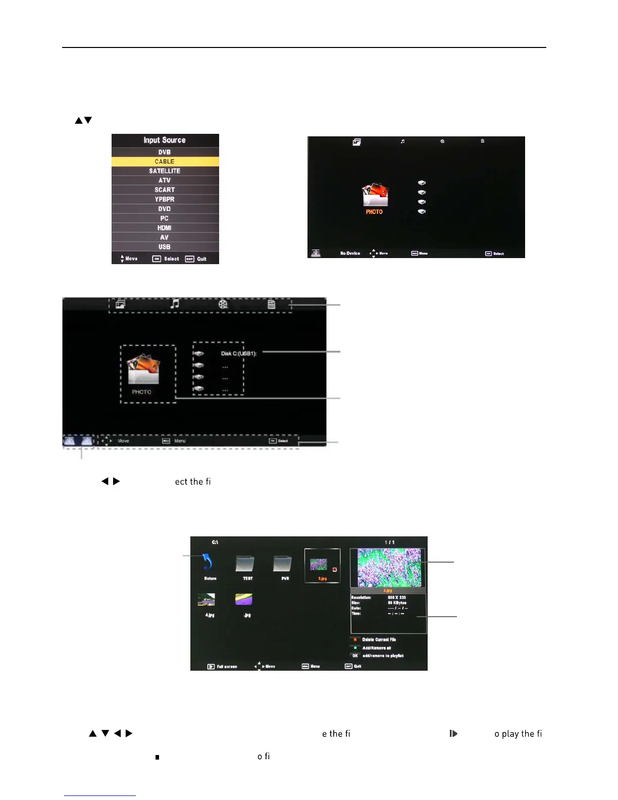/ button to sel les on the USB device (PHOTO, MUSIC, MOVIE, TEXT) to view or play.