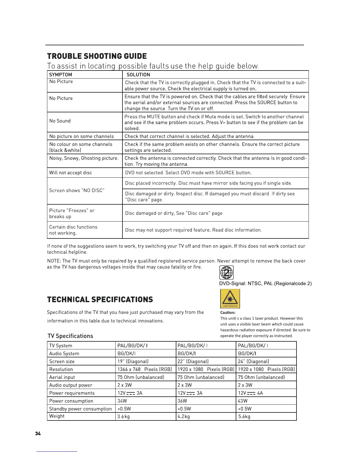 Cello C19103QUAD - Troubleshooting and Technical Specs; Common TV Faults and Solutions; Disc Playback Troubleshooting; Safety Warning for Repairs