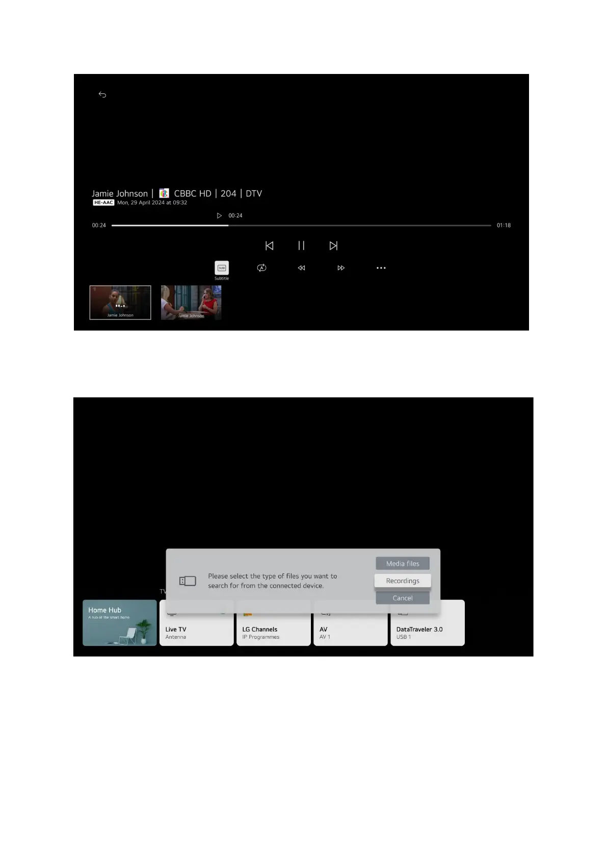 button and select your storage device from the USB input. Then select Recordings from the pop-up