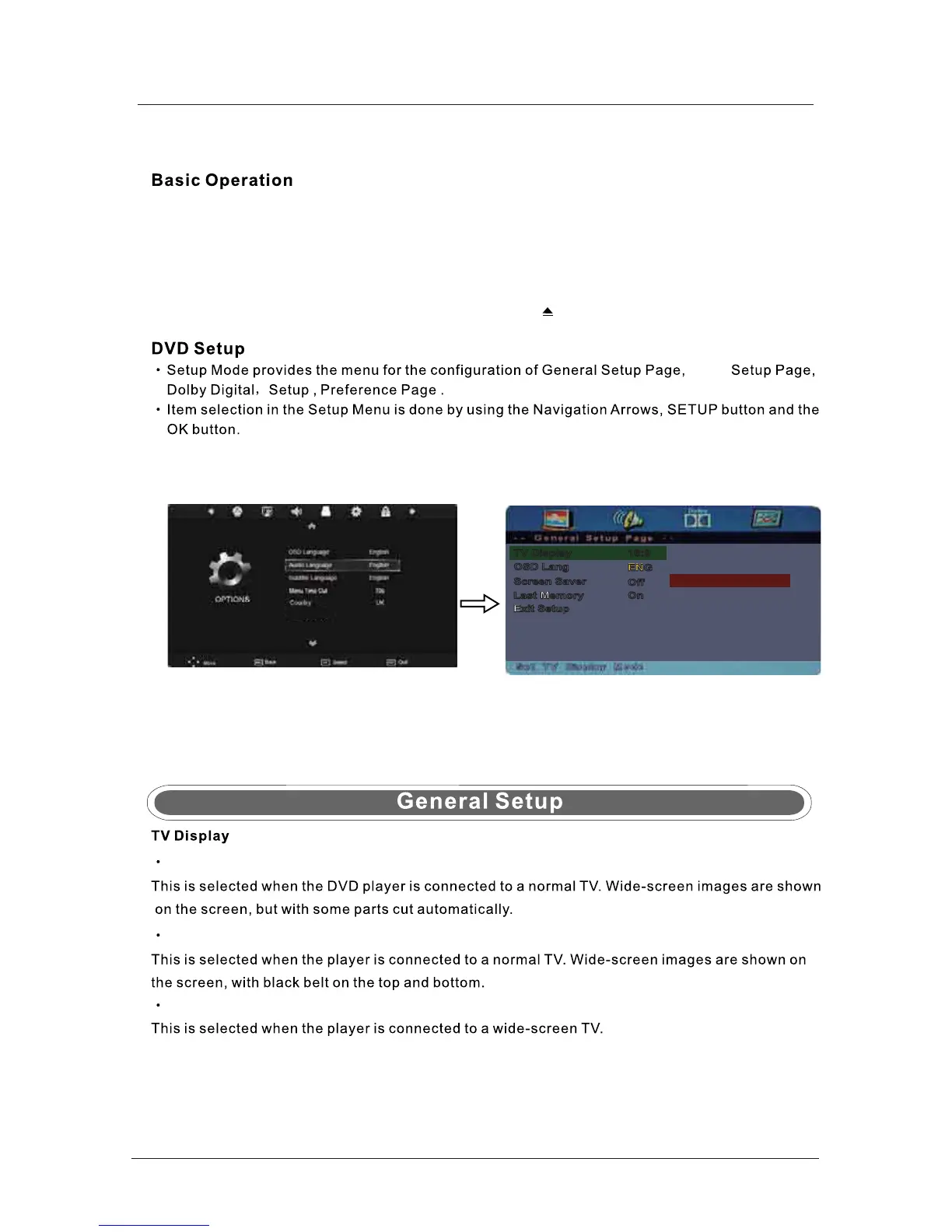 Press MENU button on the remote control and select OPTIONS menu as below, then select DVD SETUP,
