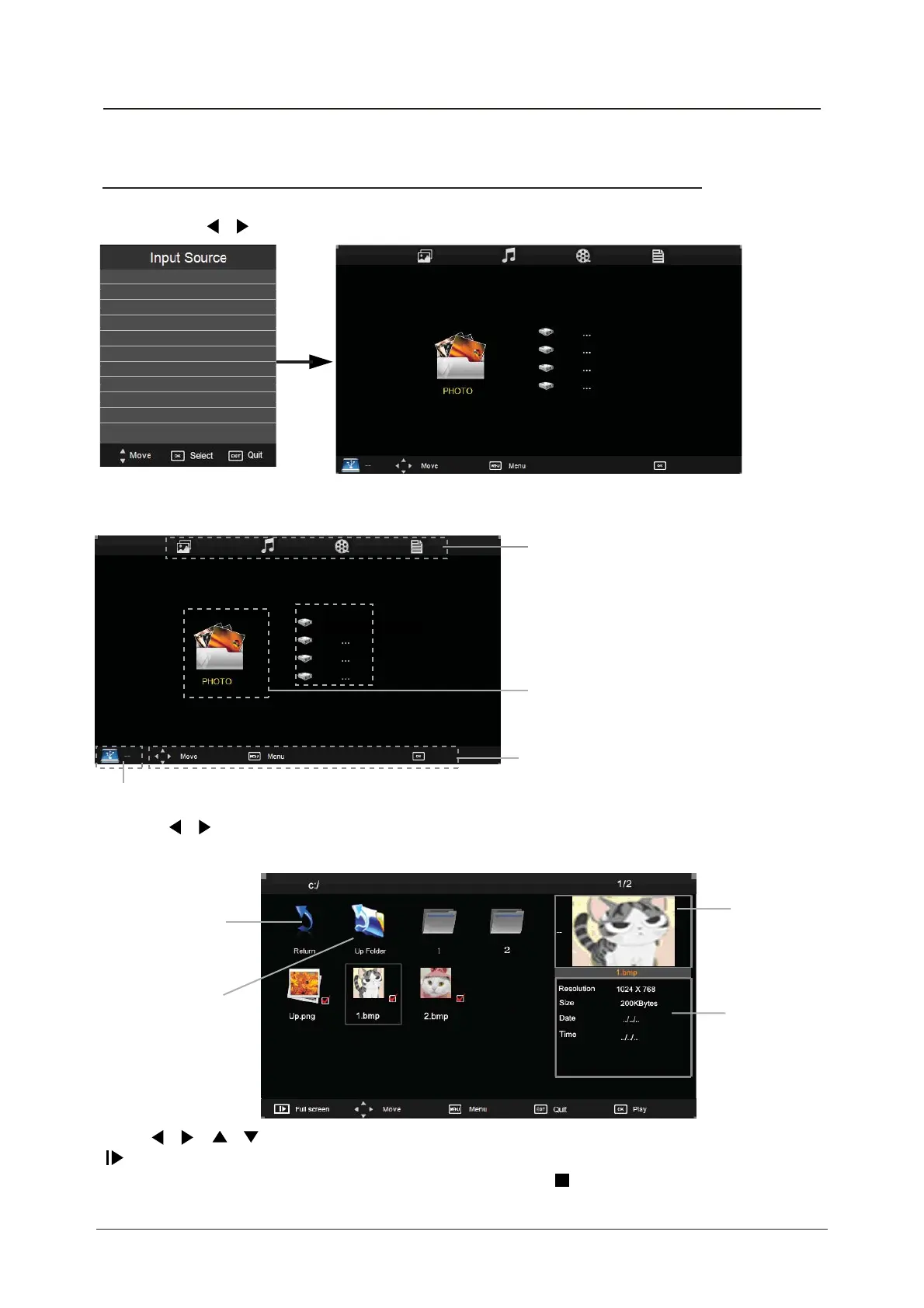 3). Press / button to select the files on the USB device (PHOTO, MUSIC, MOVIE, TEXT) to view