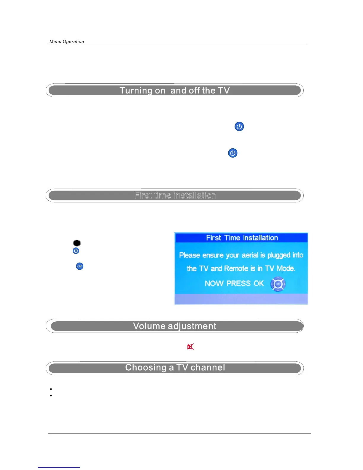 NOTE: When you initially use the TV, you will see the “First Time Installation” menu as below: