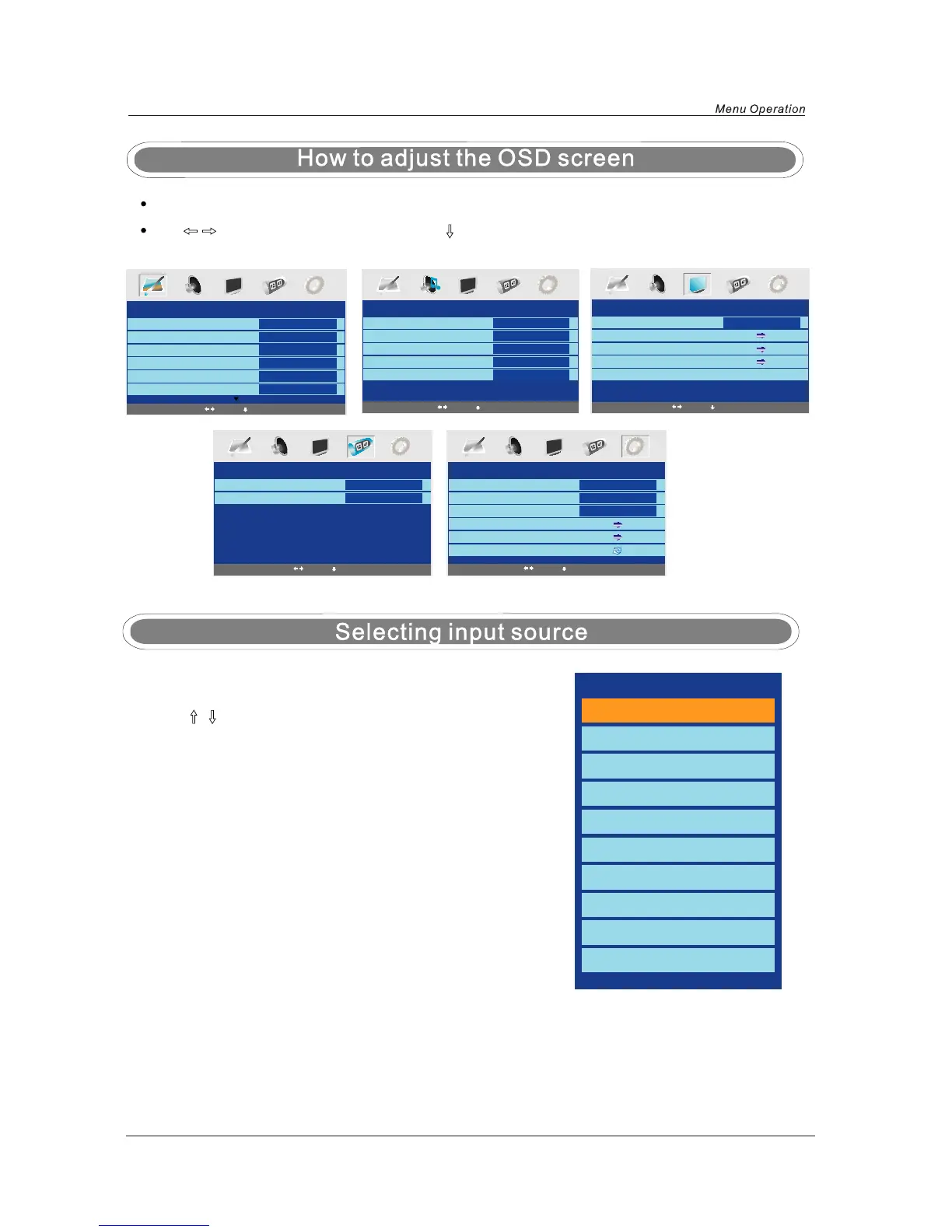 / buttons to select menu, and press button to enter the menu.